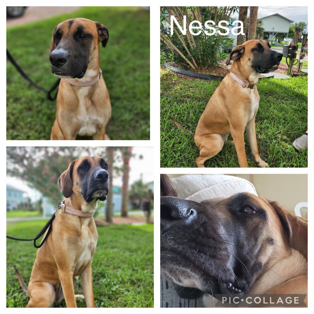 A Gentle Giant with A Big Heart Nessa is a 1.5 year old Great Dane mix weighing in at 60 lbs. Gentle and obedient Nessa is just waiting on her perfect person. Nessa loves to play catch in the yard and have a cuddle session afterwards. Nessa has recently learned that she loves loves loves to swim. Going on daily walks is a great way to begin or end a beautiful day. Nessa loves her head and face to be pet, she will nozzle her nose up to her person’s face for love. Very smart Nessa knows a lot of commands, stay, sit, shake, come, and fetch. Throw her a ball and she will bring it back. Nessa has mastered her doggy skills, she is potty, crate and leash trained. Nessa is nondestructive in the home and is off leash trained as well. Loves older, respectful kids and is great with other dogs, she would love a playmate in her new home. Nessa met a cat briefly and did wonderful ? This beautiful gentle girl is ready to find her furever person. Nessa is absolutely amazing in every way, obedient, loving, playful and just all around the best dog someone could ask for. If you love big dogs and want a new best friend, Nessa is ready to move in. All of our animals are fully vetted which includes spay/neuter, up to date on vaccines, wormed, heartworm tested and treated if necessary, up to date on flea/tick/heartworm prevention and microchipped) prior to adoption. To start the adoption process please copy the below link in your browser and complete the application. NOTE: please read our requirements located above the application. (https://forms.wix.com/705f9c23-87be-4bea-8c95-492f3f35cb4c:f9d9ef27-4849-429f-84b1-9b65ba2d977b?fbclid=IwAR27VQnO2KkVghvdYmtNkblWuZ043-xOGlz6ug8FNHSjpIJpetvQxWrwaiI) Thank you for reading and THANK you for choosing to adopt!