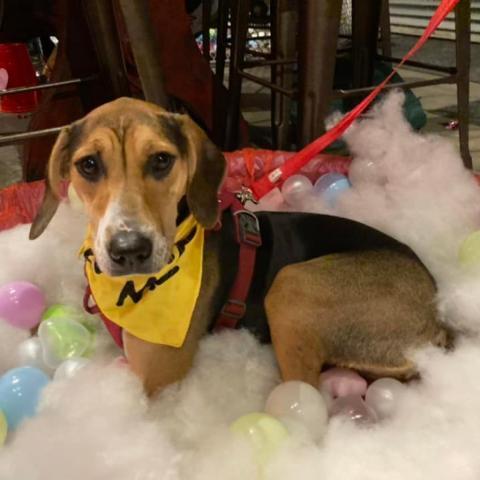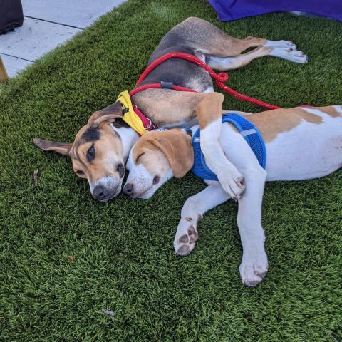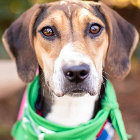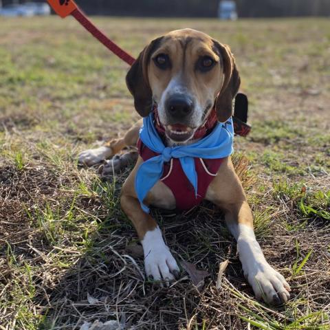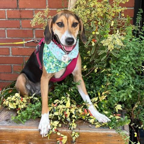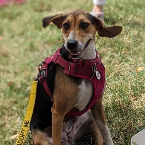 Hi - I am Bobbie ... a petite hound mix (35 pounds) who is young and playful. My two favorite things to do are zooming around the yard with dog friends and curling right up next to you for a nap or good nights sleep. Dogs do not get any sweeter or happier than me! Im such a good dog, I have earned permission to be left uncrated in my foster home! I curl up in a ball and sleep with my fosters every night..... I have neurological disorder which makes learning a bit different for me than other dogs - I was exposed to Neospora and Rocky Mountain Spotted Fever at some point. We guess I was a hunting dog that just never got my "job" so was turned loose and picked up by animal control. I have relaxed so much in my foster home, but I do have a very distinct head bob when I get nervous - its usually due to something new I am not used to seeing. The head bob is part of why Freedom Ride Rescue took me to a specialized vet to have me tested!! It not contagious or fixable - it just makes me quirky! I just want to be with people .... bonus if you have a pocked full of treats! I want to please, but I am a bit slow to understand rules ... a patient person is ideal for me! But it will be so rewarding as I will love you more than any dog ever! I have learned that life is an adventure! Where I used to be nervous - now I want to go, go, go: exploring and playing! Id make a FUN playmate for an energetic dog because I love to run and I am FAST! My play style can get a bit mouthy so tolerant canines would be best (for this reason, no small children)! It is not at all aggressive - I just stay so excited and HAPPY! I REALLY need a person who appreciates my snuggling up with them. Apply to meet me at freedom-ride.org