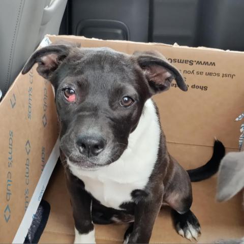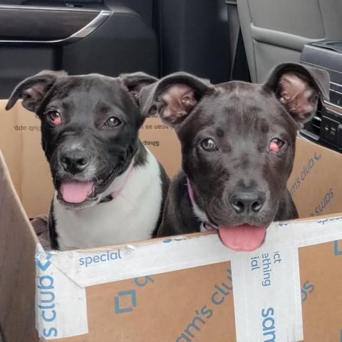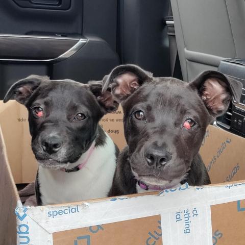 Hi, we are Laverne and Shirley and much like the famed couple living in Milwaukee and looking for a future filled with big families and love and HOMES!! We are a great pair of pups, only about 7 months old, and we were literally found dumped on the side of a railroad tracks at less than 10 weeks old :( When we were found, we each had one eye that was like a "cherry pie", I think thats what the doctor man said..... (the doc said "cherry eye!!") We were so bonded that Shirleys left eye and Lavernes right eye had the "cherry pie" :) I mean, how cute and sad is that???? We are a couple of pittie/lab pups, we are great with all people, dogs, cats and even tortoises!! We are bonded but can be separated if the right families come along. Honestly though, we are like the peanut butter and chocolate debate- TAKE THEM TOGETHER!!!! We are going to be about 50# maybe, full grown... We LOVE to ride in the car, so traveling with you is super easy, cause we are THERE! You dont have to pick us up, we load up!! I think you need to go ahead and fill out the application soon! ONE OR BOTH, we are waiting!!!! Local adoption fee is $250/each ($400 together) in TX Out of state fee is $500/each ($800 together) includes transport to your area Laverne and Shirley are adorable girls looking for adorable home/homes :) Belinda is their foster mom, belindaperz@yahoo.com