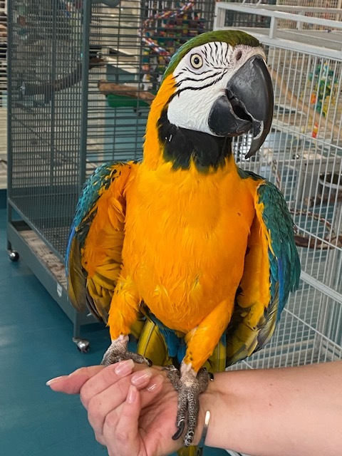 Sunshine is a 25 year old female Blue and Gold Macaw, who was surrendered due to her owners moving. She is tame and handleable and in good feather. She is a womans bird; she does not like men! She has been on a pelleted diet along with fresh veggies. She was thoroughly vet checked including bloodwork. Sunshines adoption fee is $900. PLEASE NOTE: Adoption applications for any Macaws will not be considered unless the applicant has previous large bird experience. Because large birds are so intelligent and have specific needs to live a happy life, we require their adopters to have personal experience living with/caring for large birds. If applying, please be prepared to detail personal experience. If you are interested in adoption, please go to www.centerforanimalrehab.org read our Adoption Policies and fill out the Adoption Application. Once your application is approved, we will set up a meet and greet with you/your family. We are located in Waukesha, WI and only adopt to a 100 mile radius and do not ship.