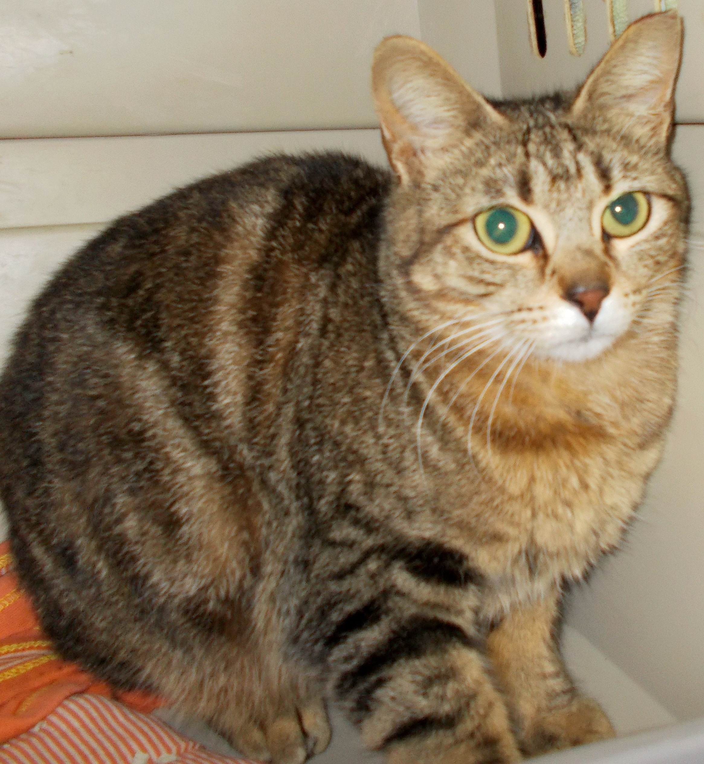 Raisin is a sweet and gorgeous brown classic tabby Manx, approx 4 years old, who was rescued from a North Chattanooga neighborhood with her siblings. She was semi feral but the man who was feeding the cats could pick her up. She is still quite shy but likes petting. She will be shy in a new environment with new people at first but I know she will be a nice companion for the right person. She would do best in a quiet adult home. Her sister is Robin and she would like to be adopted with her if possible. EMAIL:JPECATz@aol.com