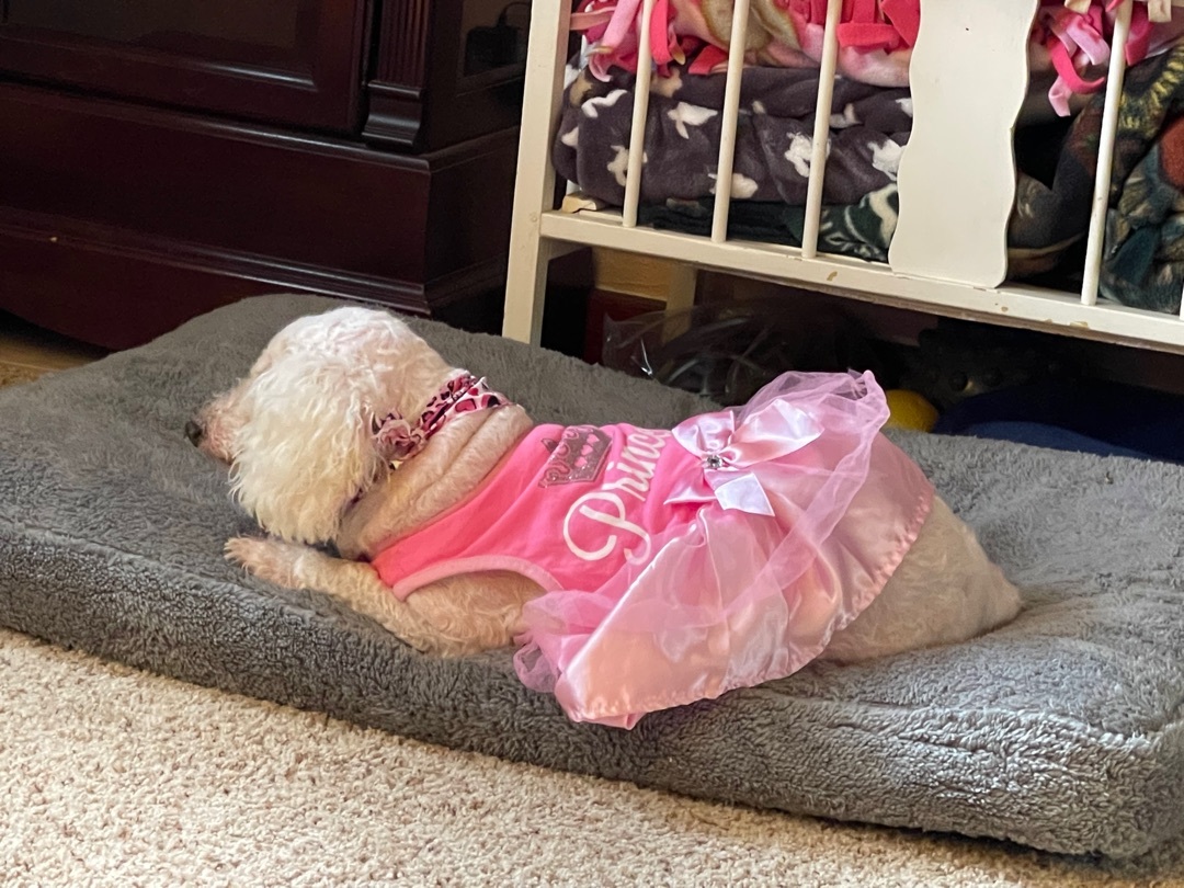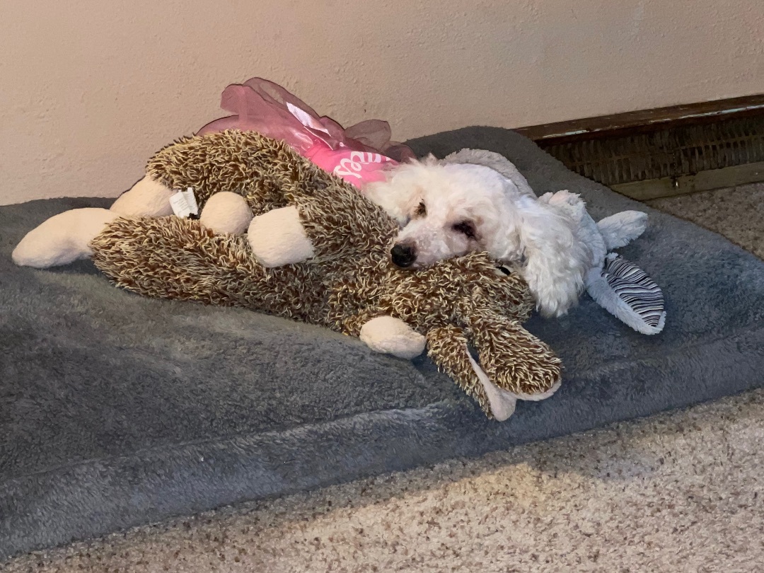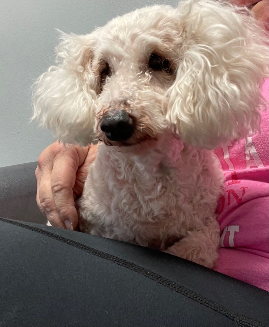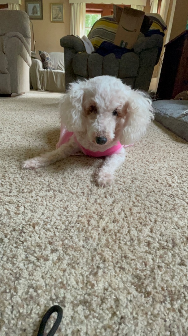 Rosie Miniature Poodle Mix Female 10 yrs old 12 lbs Spayed/UTD on Vaccinations Crate/House Trained Good with Digs/Cats/Kids Adoption Fee: $225 Hello future family! My name is Rosie. Im a laid back easy going blind gal looking for a place to crash. I love napping on soft dog beds, fluffy blankets, and even a pile of clean laundry. My favorite place is on your lap. At night I feel safest in my crate. I promise I sleep all night. Being as laid back as I am, I get along great with dogs, cats and kids of all ages. I am completely blind so I will need a little help going outside to potty. I’m a good girl and stay close to my foster mom. Although Ive had a few dental visits, I like to eat dry kibble mixed with some canned. Im a little spoiled in my golden years and love having some cooked veggies with my dinner. If you’re looking for a sweet old gal to spend some great quality time with, then I’m the one. By the way, I love going for car rides and stopping for a pupa-chino. Apply to adopt Rosie at www.almatailsofhope.org
