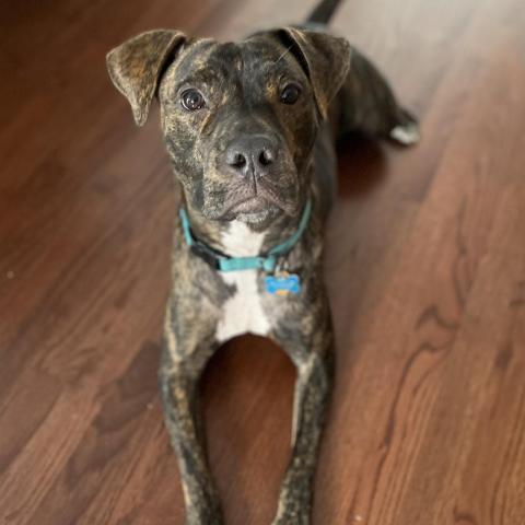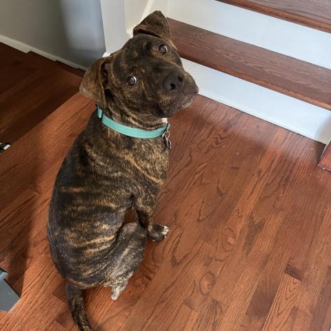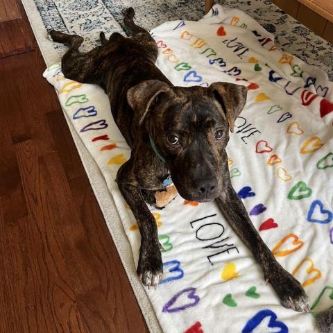 Roz is living in a foster home. Submit an application from our website and then make an appointment to meet her. Roz is not eligible for foster and will be a straight adoption. Housebroken: Yes Crate trained: Working on it! Dog sociability: She has been selective with her dog pals and may be comfortable with some but not all. She has made some dog friends and seems to do better with larger, confident dogs with a slow intro. Cat sociability: Not a match Kids: Not a match; shed prefer an adult-only home Roz is seriously the sweetest and snuggliest brindle babe! She is happy to snooze the day away by her humans side but is also great at entertaining herself with her toys. Bones, puzzle toys, and tiny stuffies are some of her favorites. Watching her carry around a tiny stuffed animal is one of the cutest things and is sure to put a smile on your face. She enjoys slow, leisurely walks so that she has time to take in all the smells. Roz has some basic commands (sit, down, touch) down and she is a fast learner! She has also done great with housetraining. Roz is a fan of both lazy days and fun adventures and she is eager to accompany her humans pretty much anywhere! Could it be with you? Rozs adoption fee is $300. She is spayed, up to date on core vaccines, microchipped and heartworm negative. **** Our adoption application stays on file for one year and can apply to any dog in our program. Once the app is submitted you will receive an email within 48-72 hours. For additional questions, email adopt@onetail.org ****