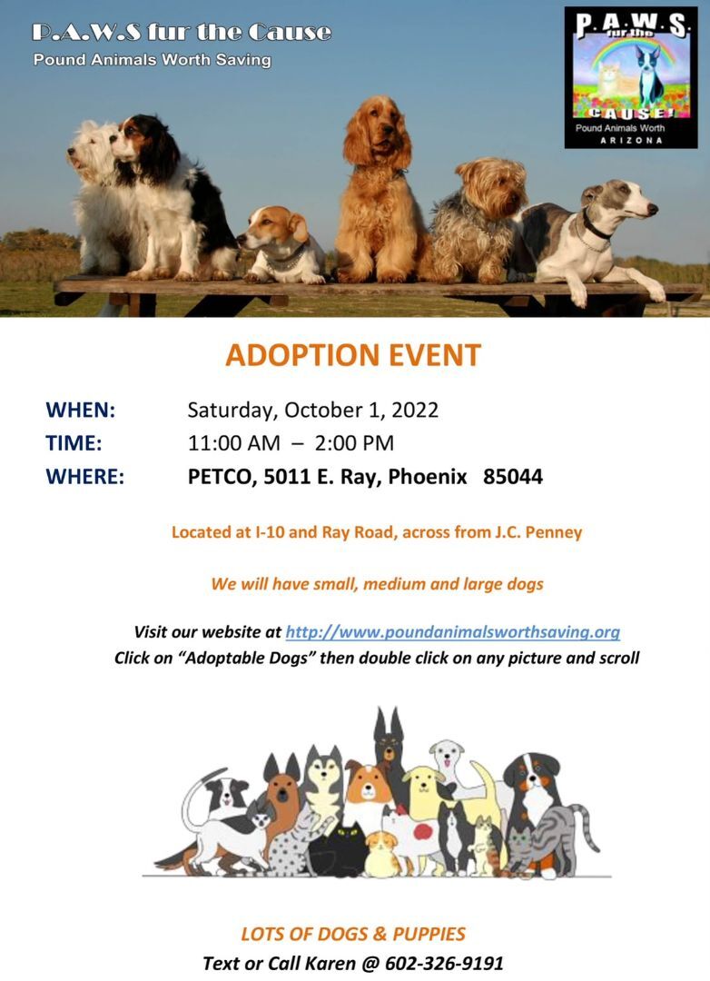 @ PETCO, 5011 E. RAY ROAD, PHOENIX 85044 ON SATURDAY, OCTOBER 1, FROM 11 AM - 2 PM FOR ADDITIONAL INFORMATION PLEASE TEXT OR CALL KAREN @ 602-326-9191 To see all dogs: www.poundanimalsworthsaving.org click on Adoptable Dogs then double click on any picture and scroll. Best to come to the event early to fill out an easy prequalification form. We try to find the right fit home for each dog. If more than one qualified party is interested in the same dog we will do a lottery where we draw for names. Adopter will be taking their new dog home on Saturday.
