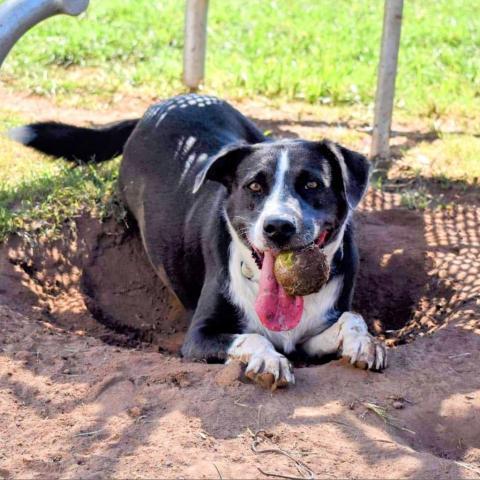 Georgia is a happy, friendly girl. She loves toys, fetch & tug of war! Shes not very good at dropping her toys, unless you have another one ready to go. Otherwise, watch your fingers because she is so excited to get the next toy!! She knows sit and spins in circles when shes excited. Her previous owner said she digs some and is scared of thunderstorms. She may be not be good at sharing toys and possibly is dog selective so a meet and greet is recommended. Georgia is always smiling and wanting snuggles. She has the softest coat and is just beautiful!!