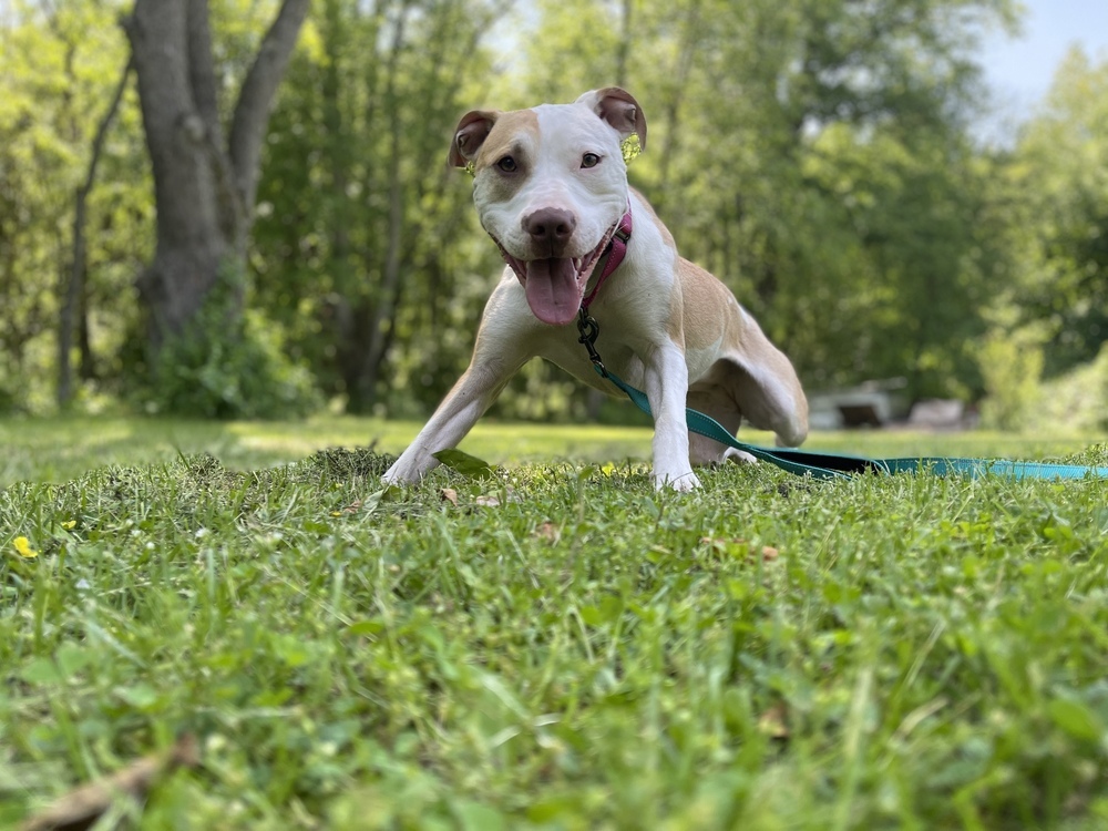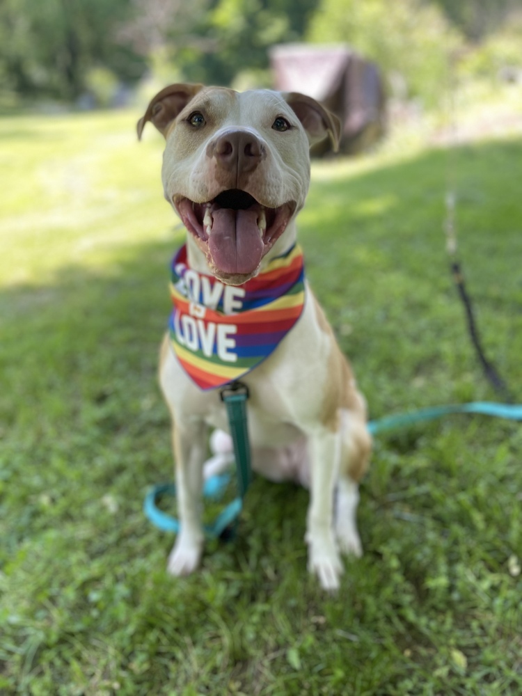 Harley Quinn is an energetic young pitty mix. She is good with other dogs and loves to play, play, play! She is doing well with potty training and is starting to pick up on leash manners. She would do best with older kids, due to size and energy level. She is super loving with people and is excited to happily flop into the nearest lap for kisses and snuggles. She loves to eat, loves her daily walkies, and enjoys watching TV and eating popcorn with her people. If youd like to meet her, visit www.happyfeetpetrescue.com for an adoption application. Happy Feet Pet Rescue (Lansing, MI) is a foster-based rescue which means each of our animals are in home environments. We strive to pair each of our rescue animals up with the most appropriate homes. Our adoption process involves an adoption phone interview, reference checks, vet checks, an application review, and meet and greets. We do not adopt any dogs that are expected to be over 50lbs to anyone living in an apartment/condo setting. We do not believe in declawing cats, and we only adopt our cats as indoor cats. We do not have a physical building that you can visit. If you are interested in meeting one of our pets, please complete an adoption application on our website: www.happyfeetpetrescue.com. We do not respond to the Pet-finder Inquiry emails.