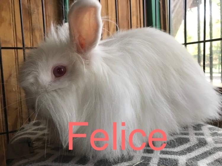Felice is a Netherland Dwarf & Angora mix bunny with white flowing single coat fur. She was pulled from Animal Care Services where she had been surrendered and was very dirty and matted. She is now all cleaned up with the mats removed and is looking like a cute little white fluff ball. She is still scared and nervous but with love, patience, and lots of attention she will realize that people can be nice. She will require regular combing to ensure mat removal. She weighs 3 lbs. She has be spayed, vaccinated against the Rabbit Hemorrhagic Virus, microchipped, and litter box trained.