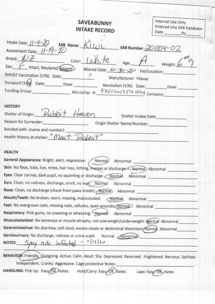 Want to know why Im named Kiwi? It might be because Im sweet and one-of-a kind. Or maybe its because my breed is called New Zealand Whites (even though our breed did not originate there). Another option is that I was named after a beauty company that is cruelty-free and doesnt test on animals. You can pick the reason you like best. But as long as you are making choices---pick me! Im a fabulous, stunningly beautiful and sweet rabbit. I just want to love you and flirt my way into getting extra treats. The past is the past, and I hold no grudges. But, I do have memories. I was a lab rabbit from a medical testing facility. They allowed me to leave and go into rescue when the tests were completed. Ive healed by being super happy, grateful to be alive able to run and play like every bunny deserves. If you dont see the beauty in my rose, ruby and lavender eyes, then we wont be a good fit. I dont care about looks. That would be shallow and unconditional love is not shallow. To see all the available rabbits at SaveABunny, please visit http://www.saveabunny.org/rabbits/allavailable