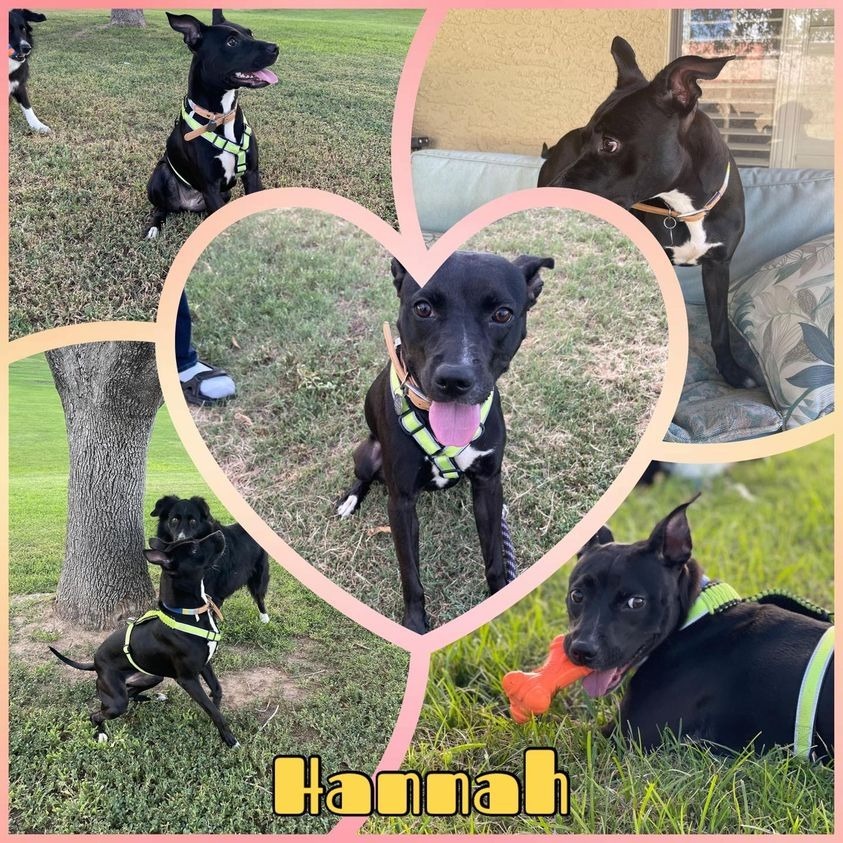 Meet Hannah! This sweetheart is a 1 year old, pittie mix with so much love to give! She has a playful side and will get the zoomies, but is also calm, mellow and sweet. Hannahs coat is so velvety soft and she loves scratches! Though she is on the smaller size for a pittie, weighing only about 35lbs and she is very athletic and LOVES to eat. That being said, she does a great job of respecting other animals space at mealtime. She aims to please and is very food motivated! She doesnt bark much at all and is great with big and small dogs, as well as cats. Hard rubber toys are her favorite! Hannah is happy to entertain herself or play with a furry friend or her human fosters. She is still a puppy and does show off her puppy antics from time to time, but has a great disposition for such a young dog!