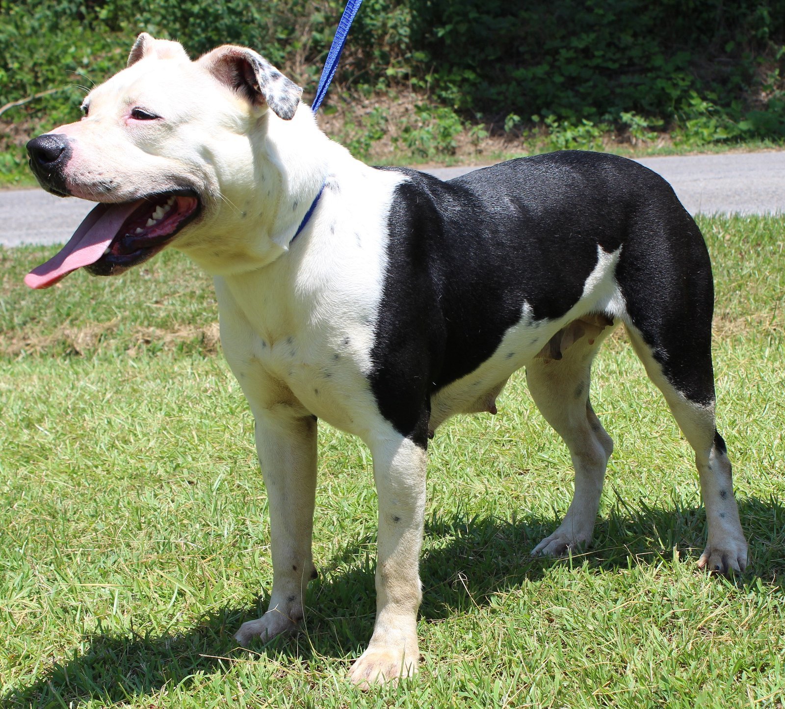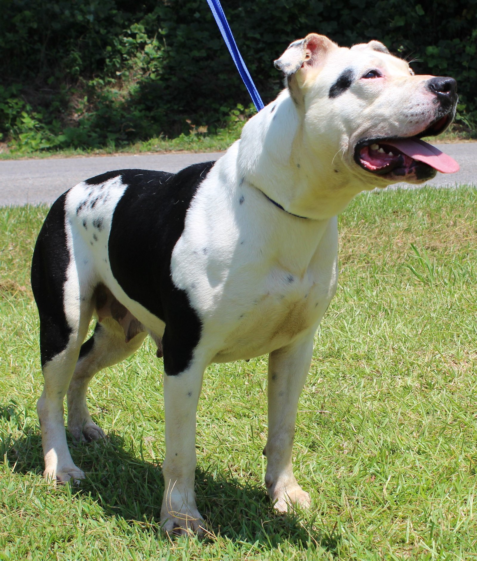 Sadie is a 2-year-old female Pit Bull Terrier who must be spayed before she is adopted. She is a good looking girl who has a white coat with black markings. Sadie weighs 70 pounds so she is a big gal! She is high energy and needs a securely fenced yard where she can safely play. Sadie is both leash trained and house trained. We cant emphasize enough how strong and hyper Sadie is. She loves to be outside and play in the fenced yard. Due to her activity level she should not be adopted to a family with small children--older children only. We believe Sadie would be okay with other dogs who are similar in size to her. If you have another dog you would need to bring your dog to the shelter for a meet and greet with Sadie. We feel like the ideal adopter for Sadie would be an experienced dog owner who is willing to accept the challenge of teaching Sadie acceptable behavior; and willing to be patient and understanding with her as she learns.Dog/puppy adoption fees are $75 and cat/kitten adoption fees are $35 (as long as funds are available). Our adoption fees cover a microchip, microchip registration, discounted spay/neuter certificate, deworming, vaccinations (as age and law requires), and a courtesy vet exam at participating offices. Unless otherwise indicated under special needs our dogs have screened heart worm negative.