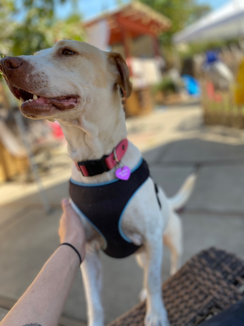 Say hello to Jade! Jade was rescued along with her 3 pups after we found her with a broken leg after being hit by a car. Mama lead us to the babies, and we were able to rescue all of them. Jade is a very calm and relaxed dog. She is all about human affection, and is very sweet and gentle. She still likes to play (she loves playing fetch!) and loves getting human affection. Jade is fine being around other dogs, but doesnt have any interest in playing with them. Shes fine with just coexisting. Jade is about 40 pounds and we think shes a pitty/ cattle dog mix.