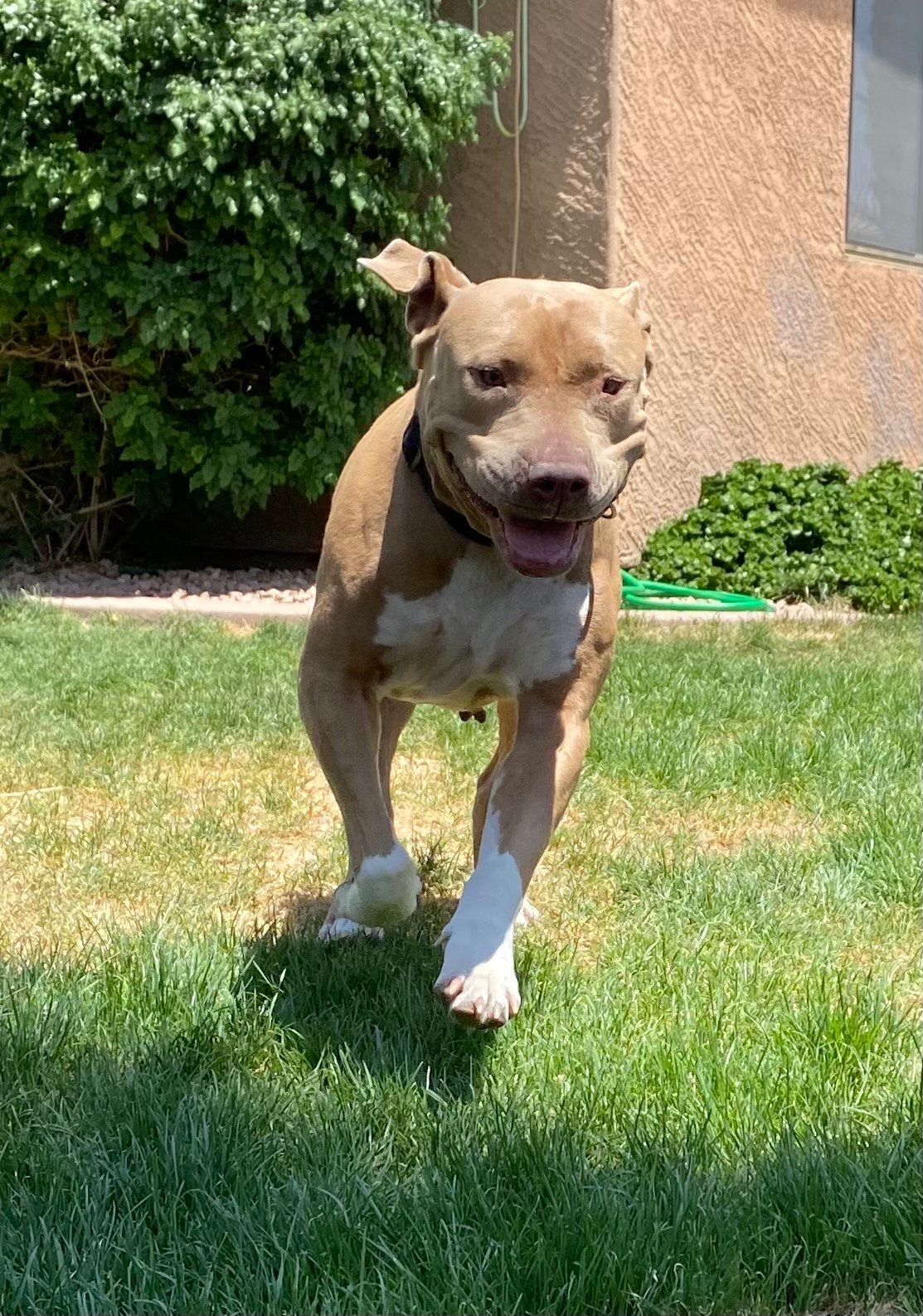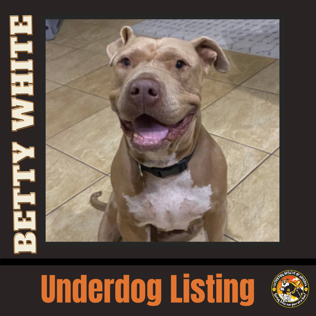 Name: Betty White Sex: Female Age: 2 years old Breed: Shar Pei/Terrier mix Weight: 50lbs Compatibility with other dogs: Good with dogs (except small dogs), with proper introduction Compatibility with cats: Not good with cats Compatibility with kids: Good with older, considerate kids House trained: Yes Spayed/Neutered: Yes Activity level: Moderate Obedience training: Has basic training Personality/Behavior: Leash trained, Lap pet, Obedient, Playful, Affectionate, Eager to please, Intelligent, Even-tempered, Goofy Requirements: Meet the whole family; Someone that works from home or is retired; No small dogs or cats in the home; Would do well in a home without a yard, such as a condo or townhome MEET BETTY WHITE!!! Link to Bettys Video! https://youtu.be/lOKEdixfltA Whos this waggy tail girl, who has a smile, wants to please, and has a friendly demeanor? Betty White! Betty White (aka "Mommas") wants nothing more than to give love and affection to a person who can show her a safe and loving environment where she can grow into the best dog she can be! This 50 lb gal has been spending her days lounging in the sun on the grass and playing chase with her foster siblings or that occasional bird/butterfly. When shes done playing, Betty likes to come inside and roll over for tummy rubs, sit for treats (she takes them gently), or relax in her crate or on the dog bed. She has shown interest in the pool by getting in the first few steps and has played with a few toys. She is building confidence on walks but still needs practice. She is housebroken, crate and leash trained, and is eager to learn new skills. Shes FABULOUS on a leash, and loves to go for walks! Betty would do best in a home where the owner works from home or is retired, but will tolerate kenneling while her family is away. She is a people dog and prefers to be with them. Once properly introduced, she does GREAT with another playful dog (see her video of playing in the yard! https://youtu.be/lOKEdixfltA ). She is not good with cats or smaller dogs but wed love if she went to a home with another pup her size that she could romp with. How can you not fall in love with that grin? If you are interested in meeting Betty White, please visit our website for our online application www.underdogaz.com