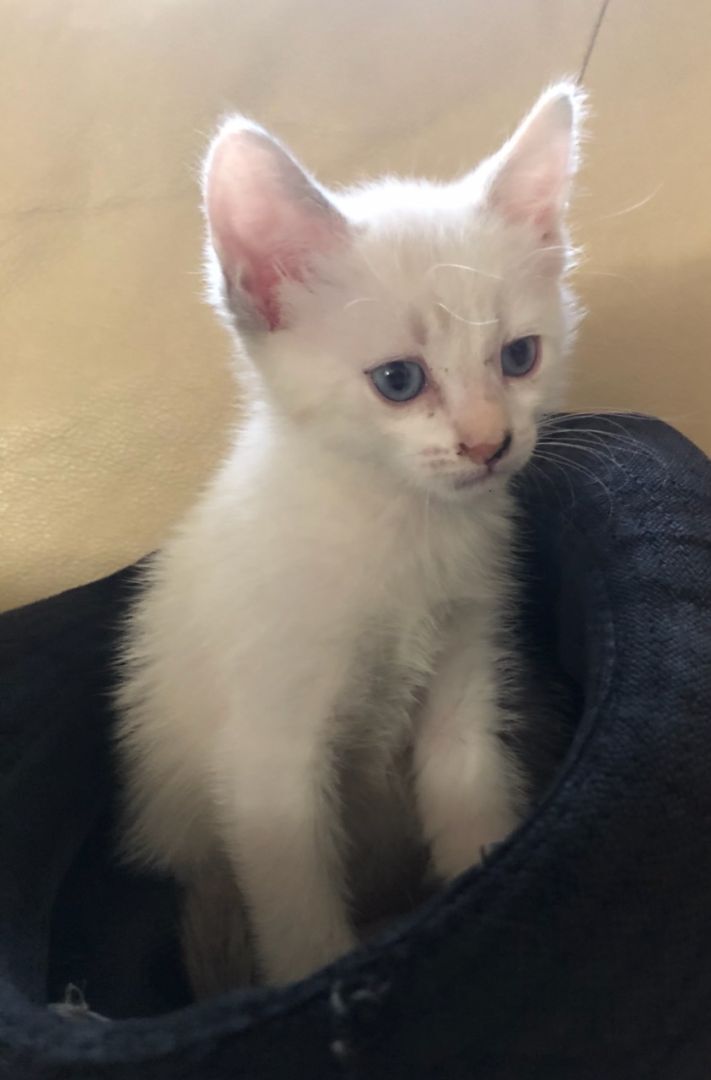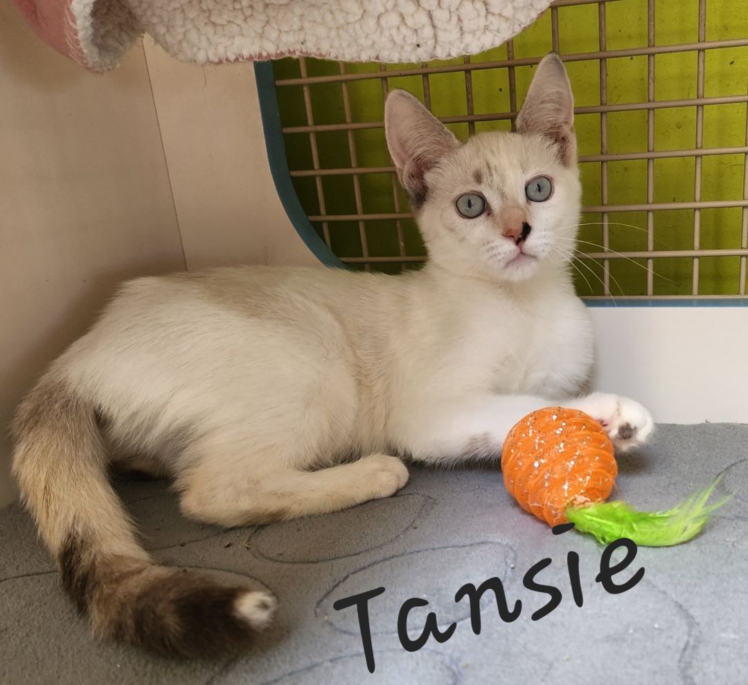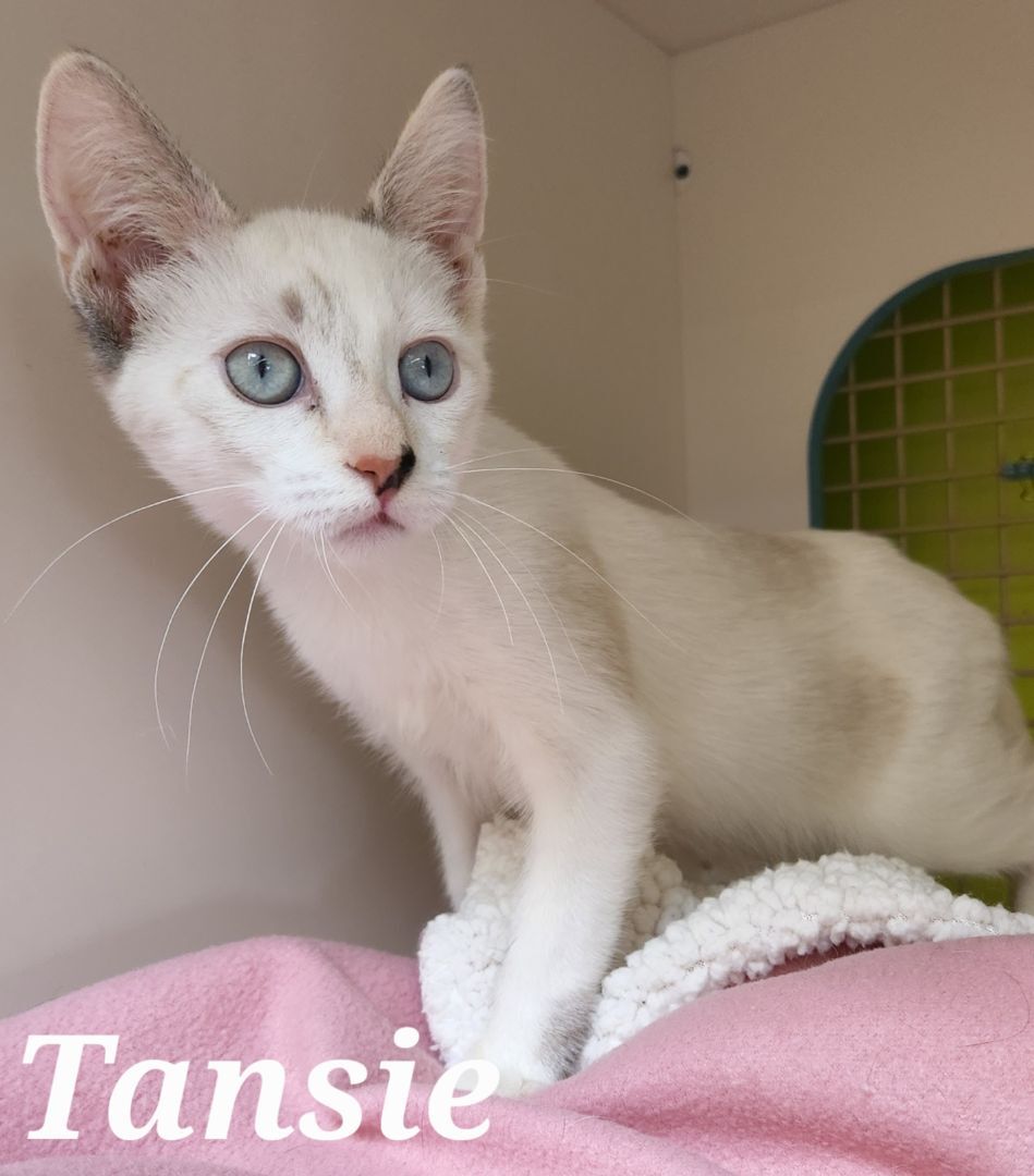 Background: Tansie is an all-white faced tortiepoint siamese. She was born on the streets to a stray mom with 3 of her siblings. All of these kittens can be held and they love ganging up on their only brother, Zane.
