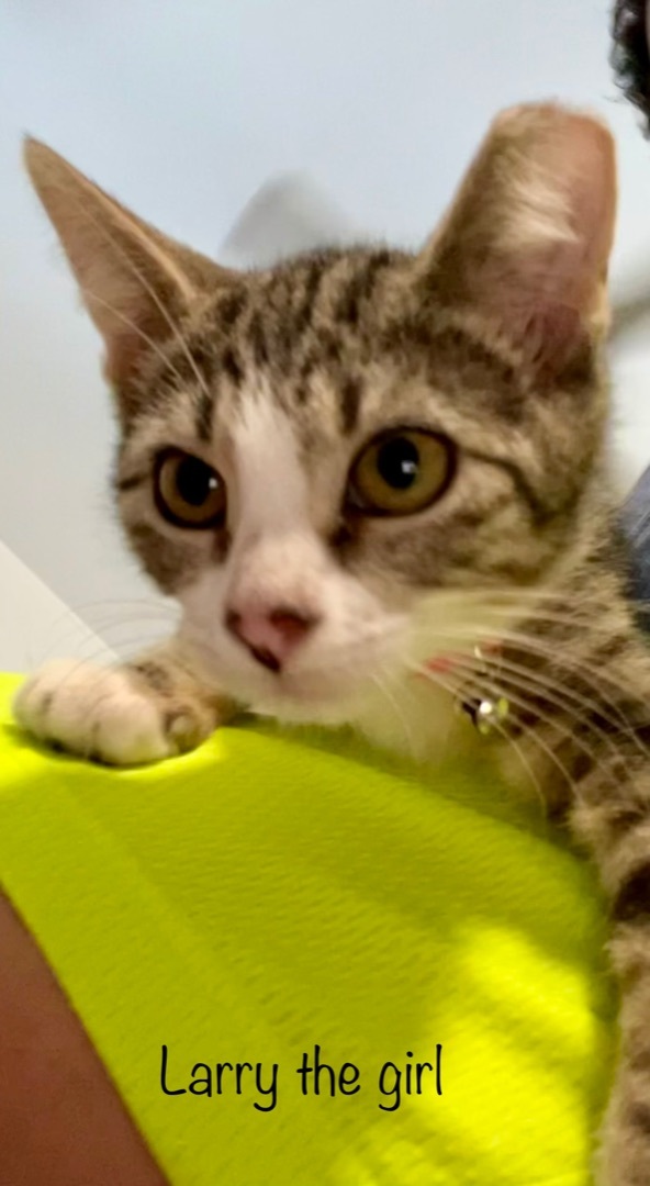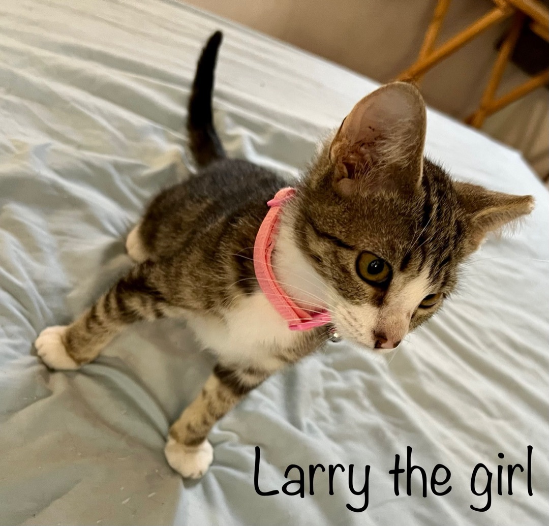 Larry is a female brown tabby with white who is four months old spayed and up to date on her vaccines. She is a little love bug who loves to be carried and will purr like crazy when you pick her up. She loves to play especially with any feather toys or the spring toys! She does get along with other cats but hasn’t been around dogs or children. If interested in this sweet girl please visit are website Treasuredfriendsrescue.org or contact her foster dad Gabriel at 219-669-4907