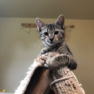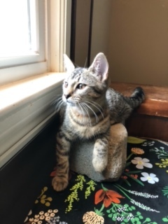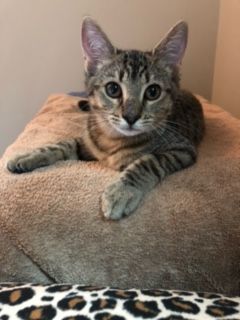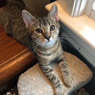 Coco is a brown tabby with beautiful tiger stripe markings. She and her sisters were abandoned in a field with their mama when they were only a few weeks old. They were lucky to find an animal lover near by who is fostering them until they find their forever home. Coco is very social and she LOVES her foster sister who is a dog. The adult cats in the house are old and cranky so Coco has not been allowed to interact with them much but they have met a couple of times and Coco is curious and respectful. Coco has been enjoying the safe and protected life of an inside kitten. She has never ever missed the litter box and she uses her scratching post like a good girl. She spends her days playing with her sisters and cat napping by the window in the sun. Coco has a very sweet personality and cheek scratches are her favorite. She loves to be cuddled and her adorable little purr lets you know how much she loves you ?spayed and UTD on shots Coco is 14 weeks old and ready for her furever home.