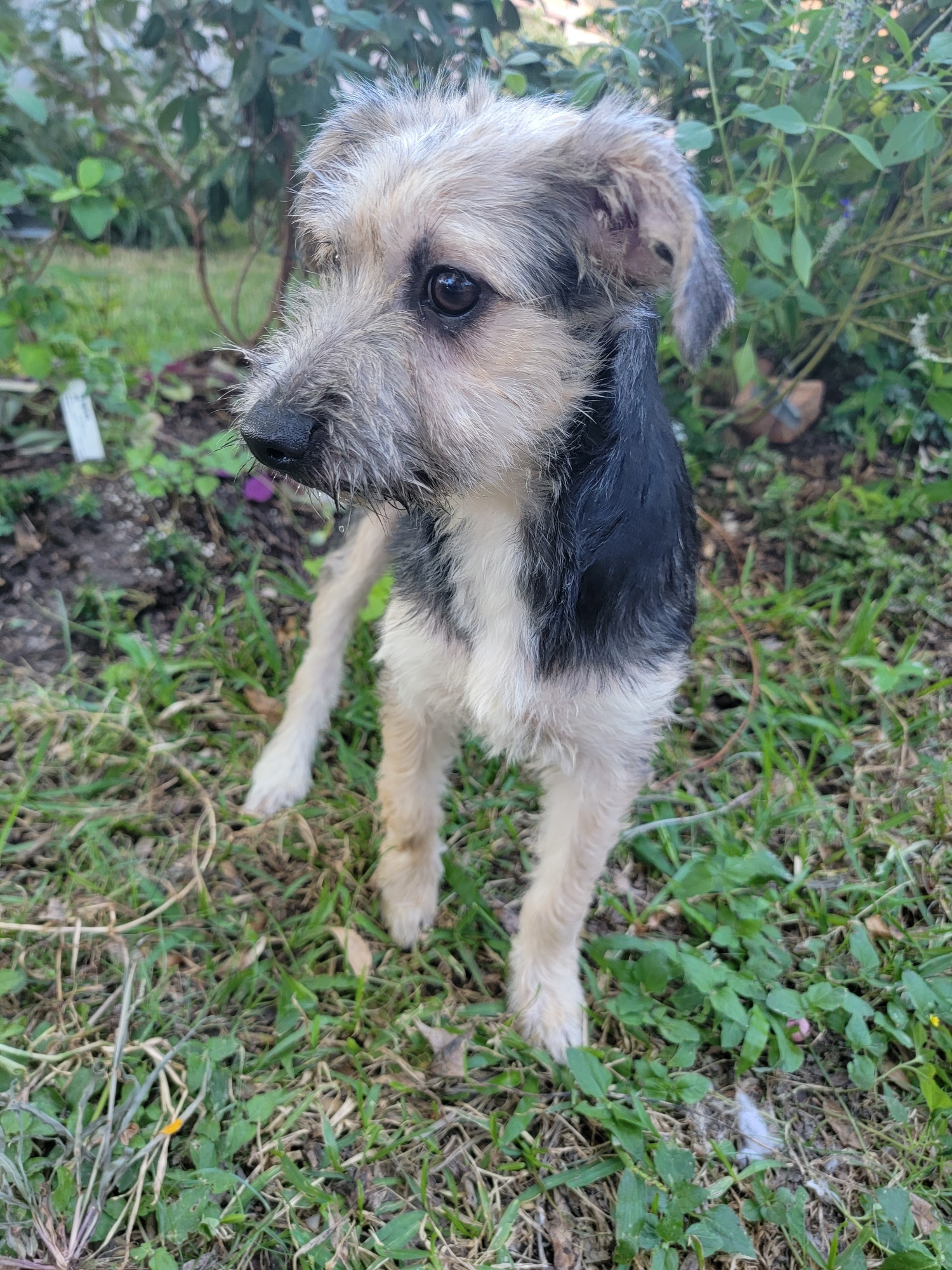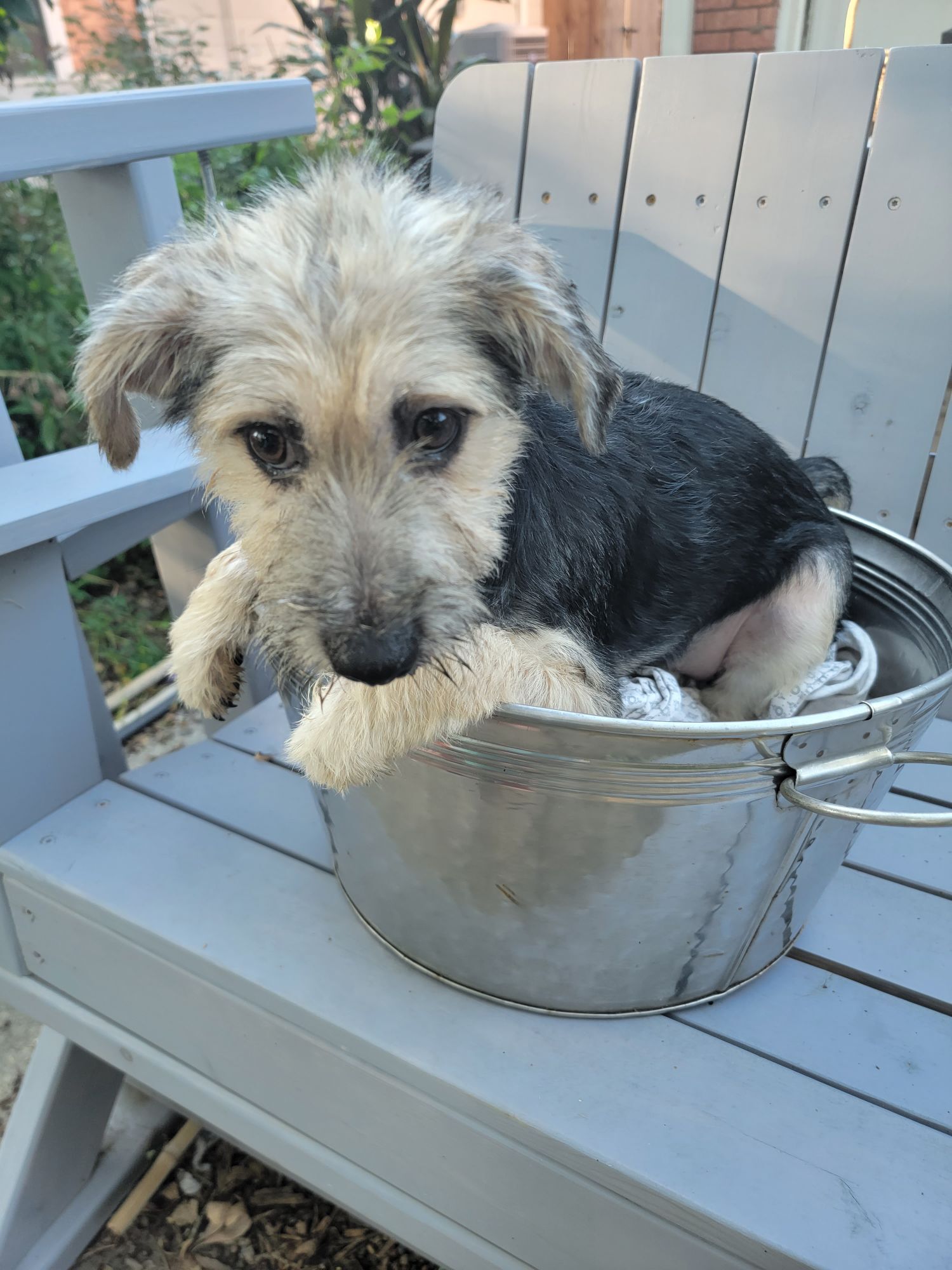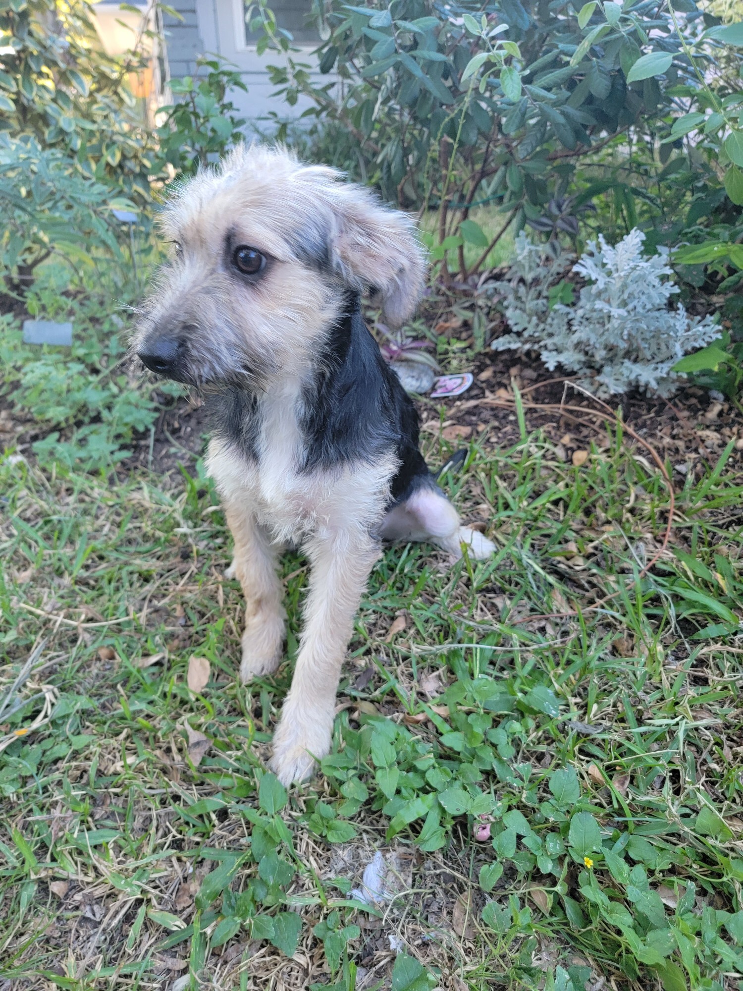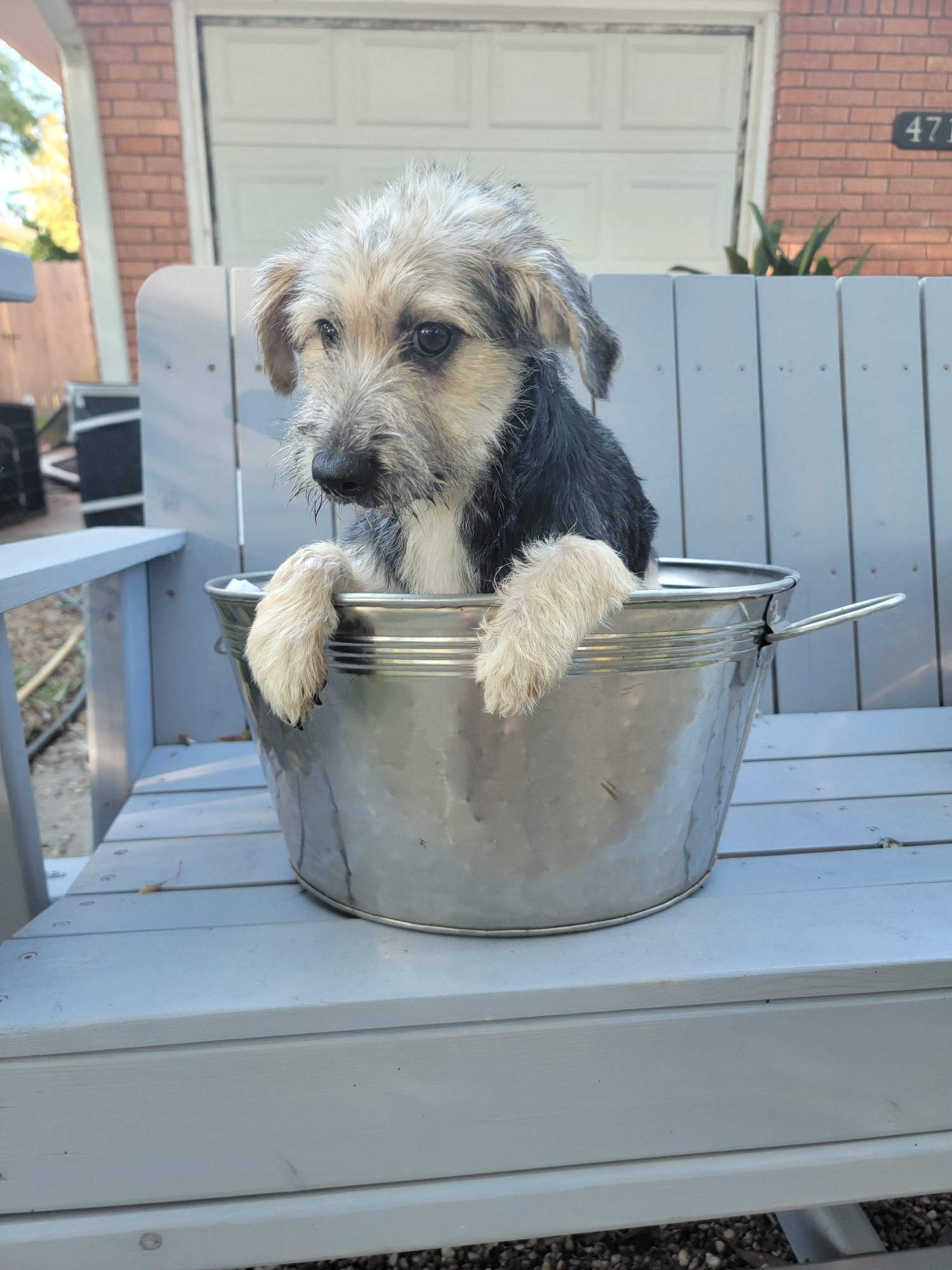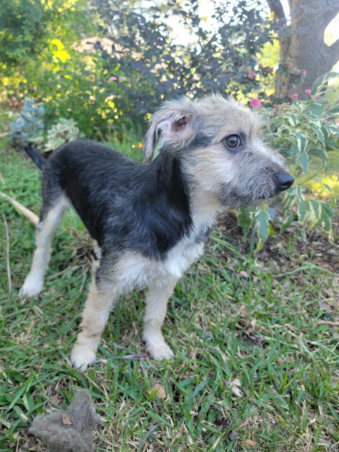 NAME: Alphie Sex: female Color/Pattern: black/white/cream/tan Breed(s): terrier mix BDAY approx.: May 2022 Description Alphie is a happy, loving girl. *Personality* Alphie is curious and adventurous. She loves to play and run and play tug of war. She will sit with you when she gets played out and loves her treats. She is trainable and loves her toys. *Background* Alphie and her siblings were abandoned near my job, they were tearing apart a fast-food bag, they were very grateful to be found and instantly fell asleep when I had them in my car. *Compatibility* Dogs - YES Cats - unknown Kids - unknown This puppy is available on a foster to adopt basis. He has received one set of vaccines so far and will be eligible to go to his adoptive home after the second set of vaccines in 3-4 weeks. Schedule your meet and greet today, this cutie will go fast! If you are interested in meeting me, please contact my rescue family at GNARHouston@gmail to arrange a visit with my foster home!