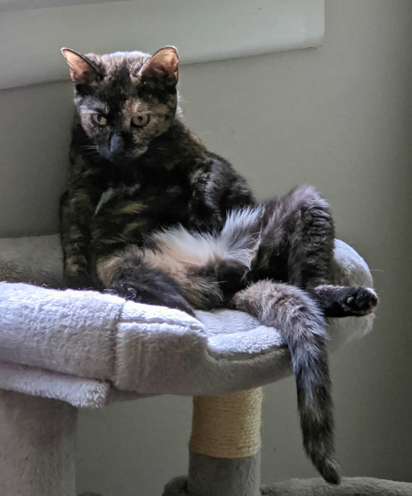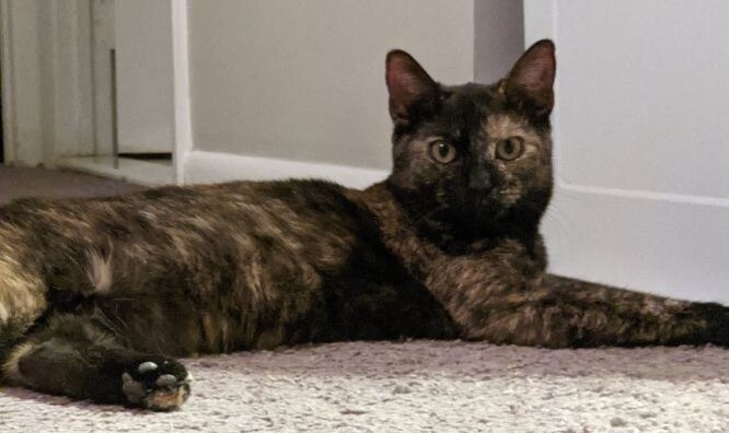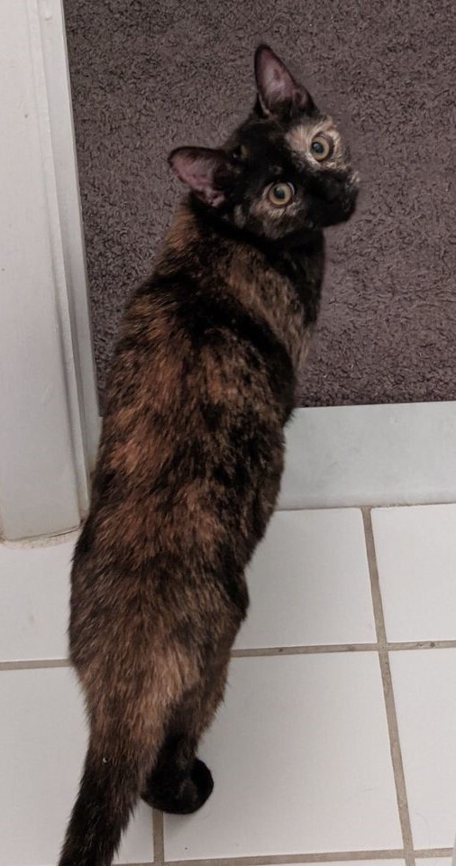 Jill is a beautiful tortoiseshell cat whose beauty will take your breath away. She would do best in a home with at least one other cat, as she loves the companionship of her foster sibling who has helped to bring her out of her shell. She also gets along amazingly with dogs and even guinea pigs. Jill has a shy and timid personality but is curious and playful beyond words. Once she warms up to her new environment she will become your little shadow. She loves to follow her foster mom around the house and always has to know what is going on. Bring out a cat toy and she will make an appearance from wherever she is in the house. Her favorite hobbies include looking out the window for birds, climbing cat scratchers and cat trees, and playing with her favorite toys. Jill may not be a lap cat quite yet, but she has made tremendous strides so far. She would make a beautiful addition to any cat friendly home who is willing to continue being patient and working to teach her that people are not scary. Jill has been spayed, vaccinated for FVRCP and rabies, flea and worm treated and is negative for feline leukemia and FIV.