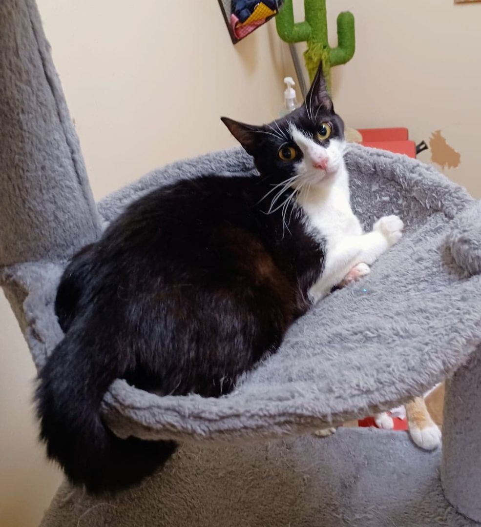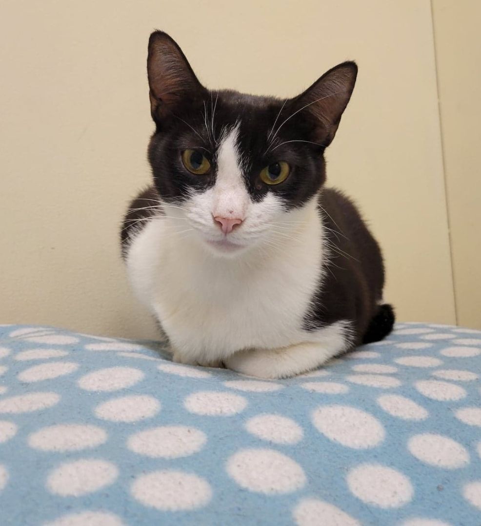 JENN YU is DOMESTIC SHORT HAIR / TUXEDO MIX. She is about 1 year old and is good with cats and non- reactive to dogs. She has never been around young children.
