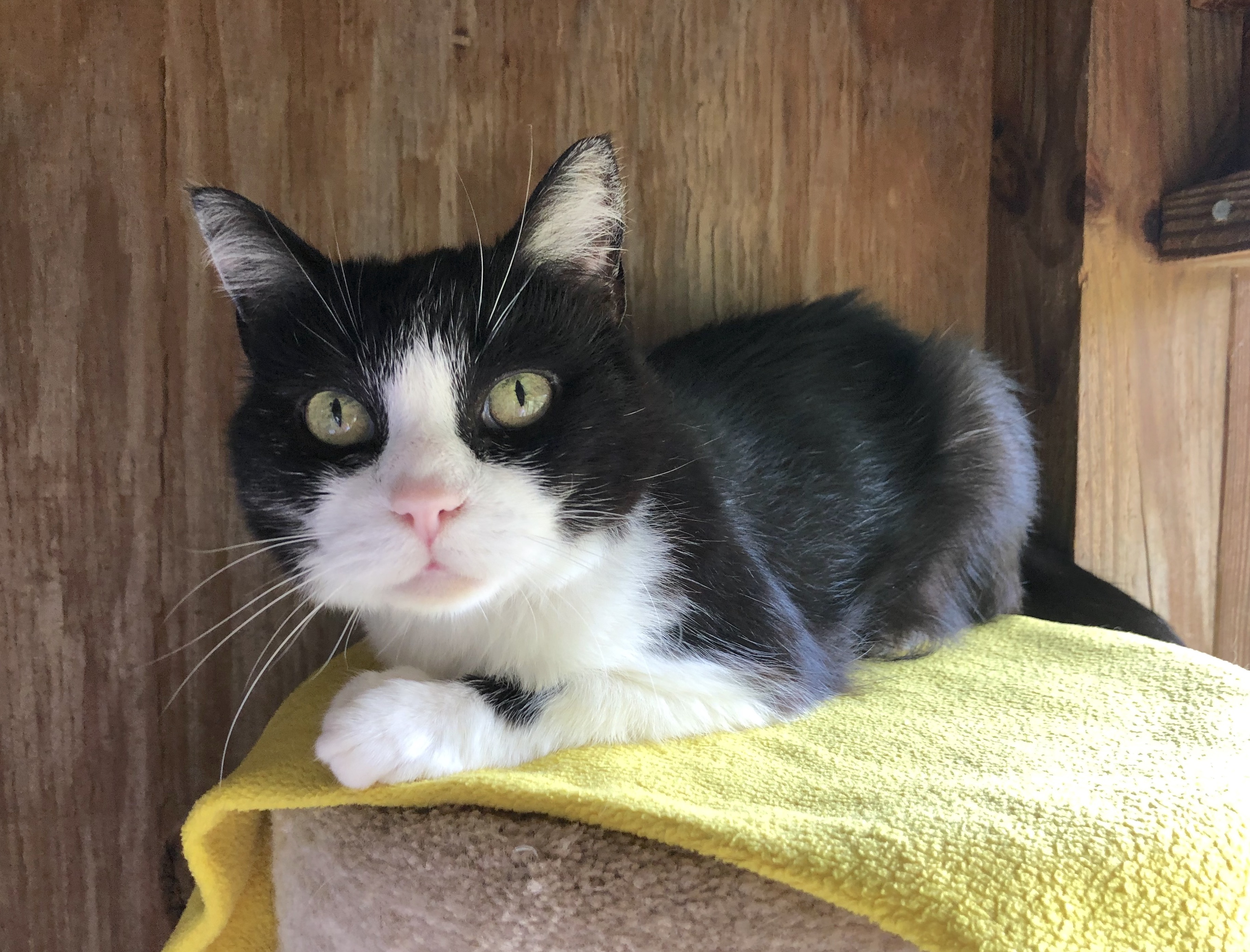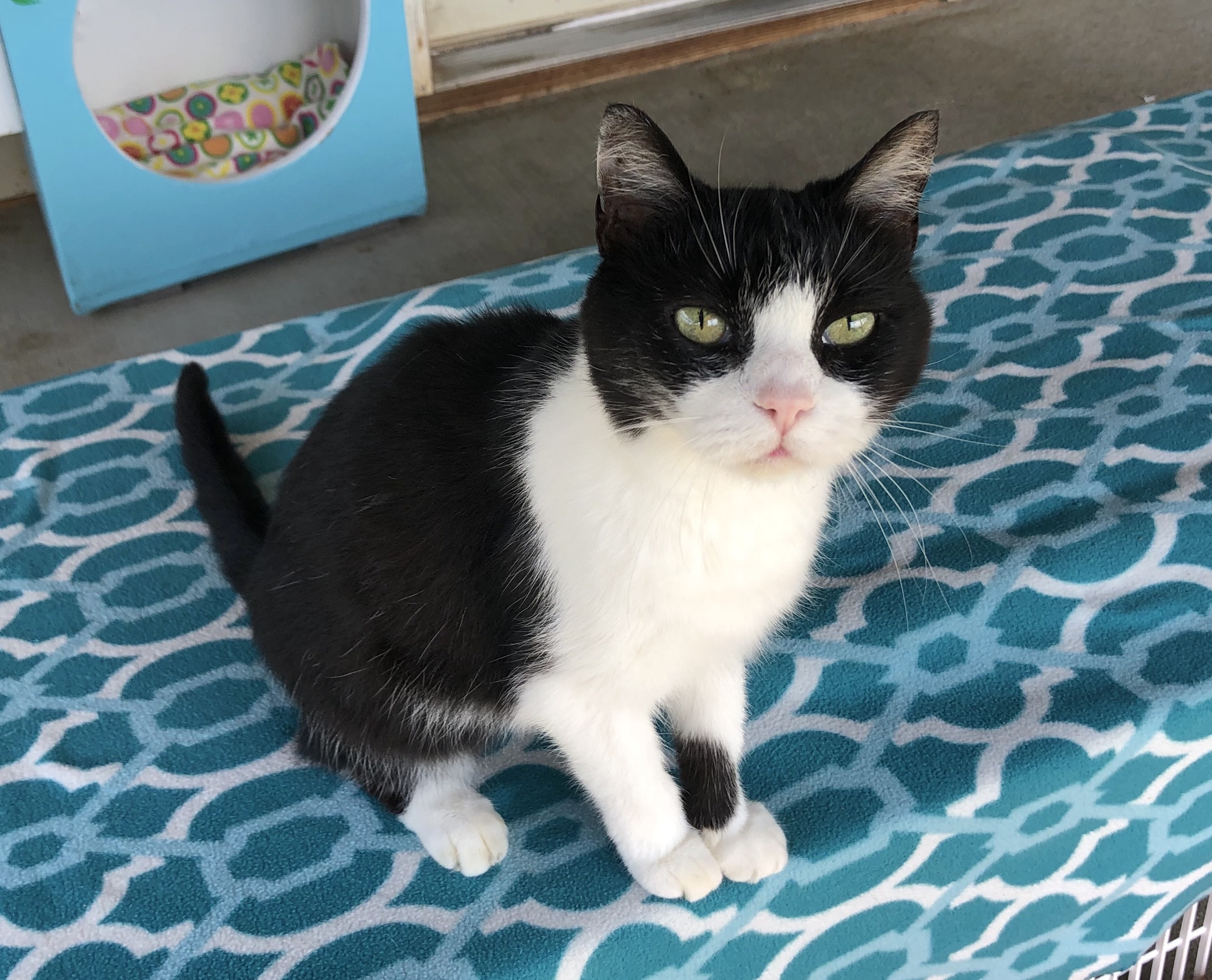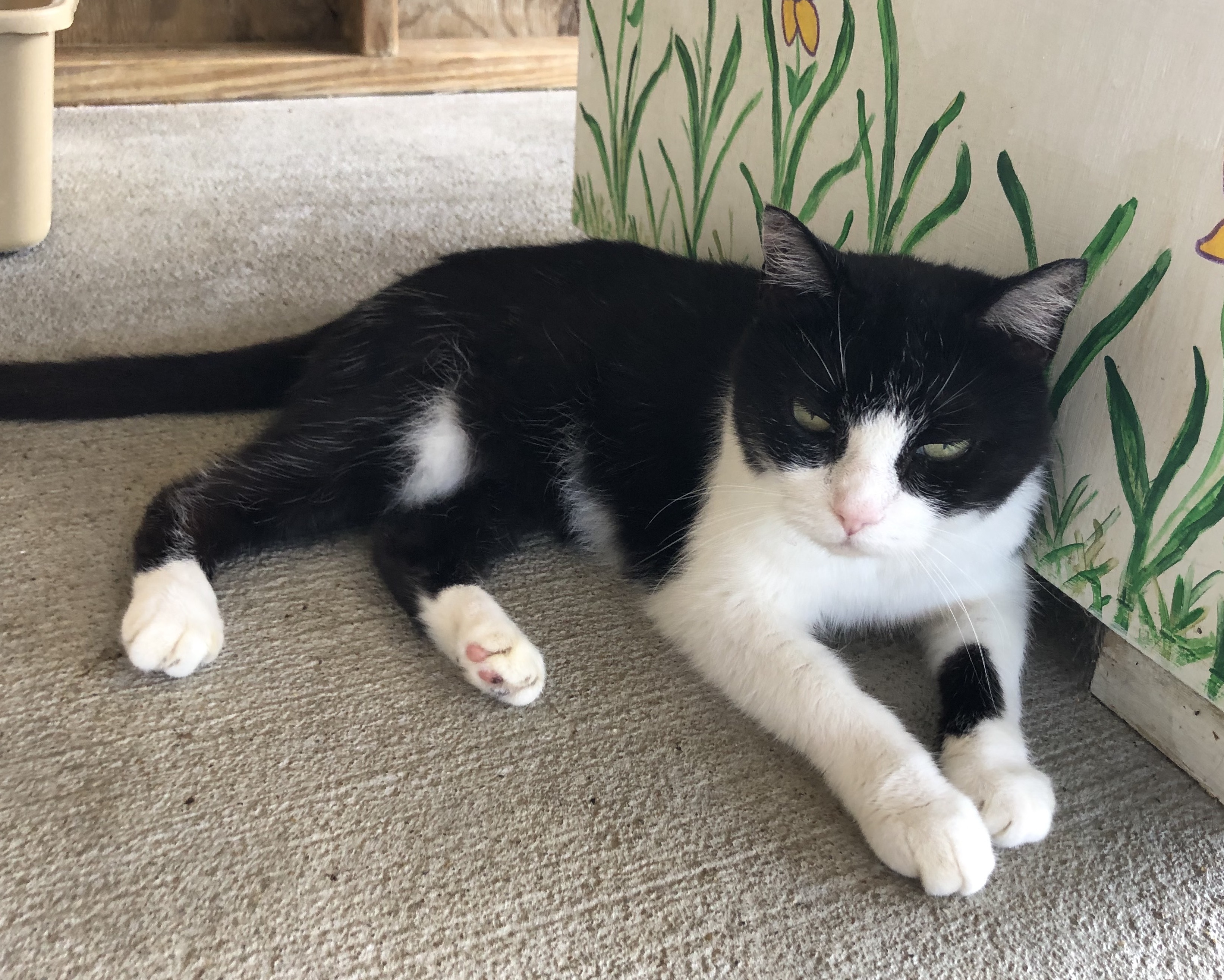 COME PET ME! YOU KNOW YOU WANT TO! THE BASICS: DSH; black and white ADULT FEMALE; EST DOB: 2015 ARRIVAL: May 30, 2020 HISTORY: Vivien was a transfer from the Fluvanna SPCA. MEDICAL NOTE: Vivien tested positive for feline leukemia virus. Vivien is a happy cat who wears her tuxedo with aplomb. One of the first to greet visitors to L3 and incredibly receptive to pets, Vivien has won over many with her polite, easygoing personality. Vivien can sometimes get overlooked because she doesn’t demand attention like some of the other cats in her room, she just waits for you to come to her and is happy when you do. Vivien roams all around the room and porch so might be found outside, on top of a condo, on the floor, or any number of other places. She likes to make use of all the amenities CFC has to offer! Due to her FeLV+ status, Vivien cannot be kept with cats who do not also have the virus. She gets along great with others, though, so would make a great addition to a FeLV+ cat home!