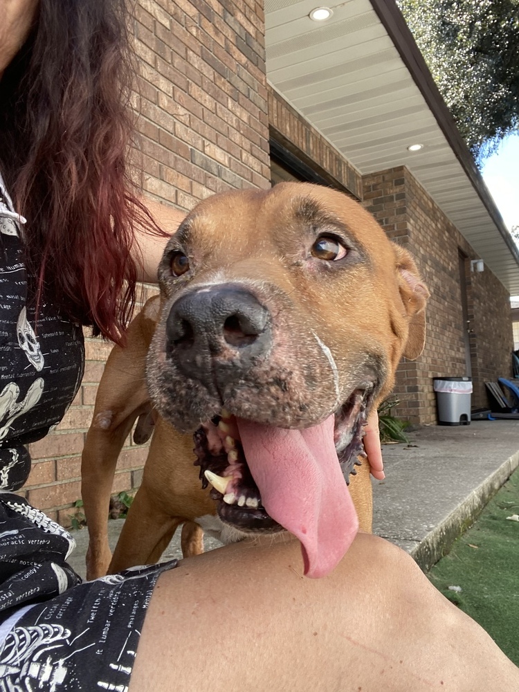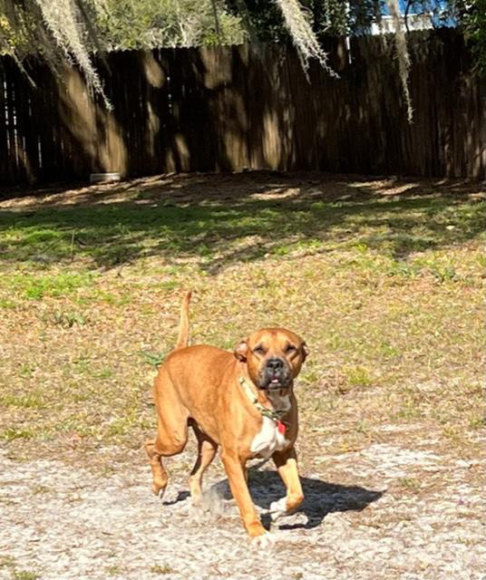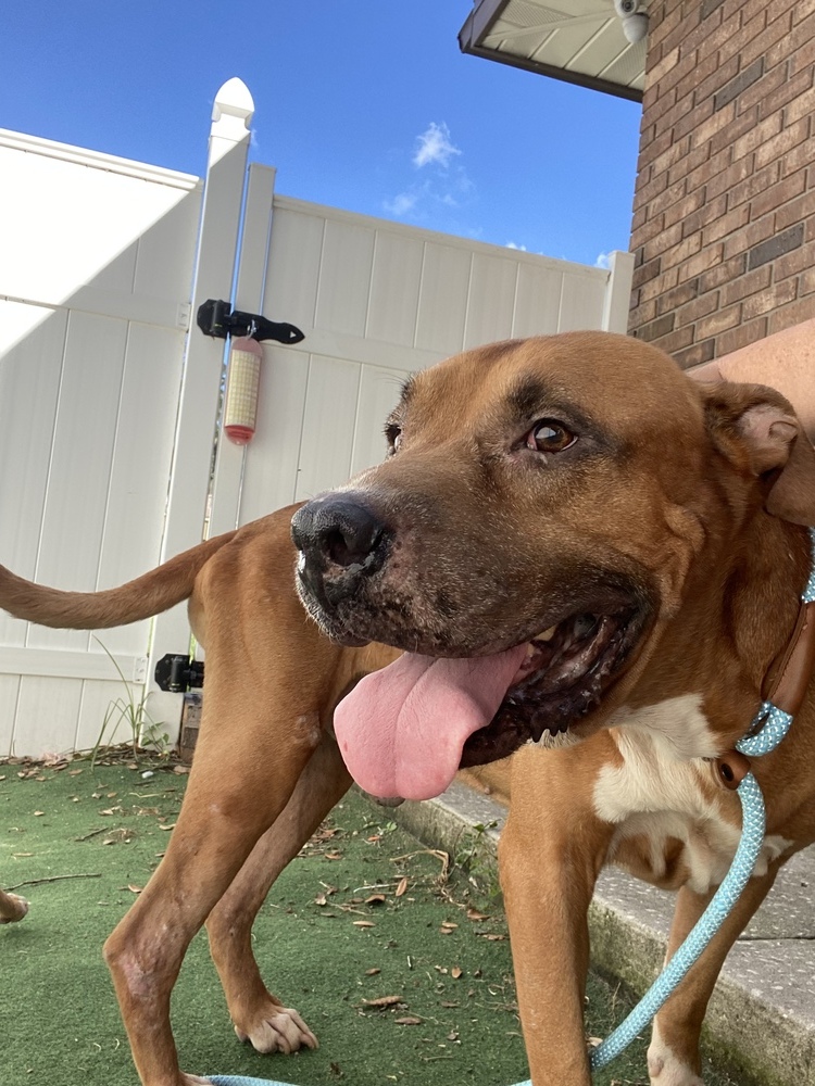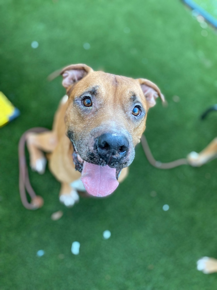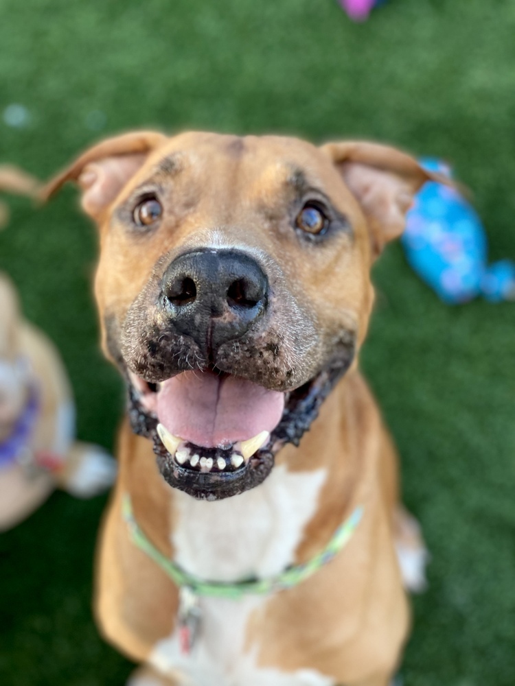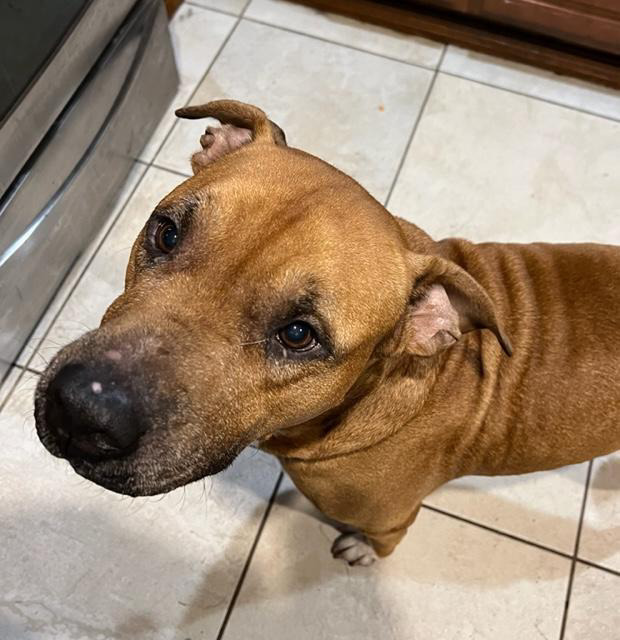 Terry is an adult American Bulldog/Black Mouth Cur mix. He came into our care in October of 2021 and has been waiting for his forever home since! Terry absolutely adores children, his current best buddy being his foster families 7 year old granddaughter. He also does well with female canine companions. This loving boy may just have missed his calling as a walmart greeter, given his extremely sociable disposition. He loves to greet everyone who comes over for a visit. Some of Terrys favorite activities include walks, car rides, and sun bathing in the backyard. Better not forget about mealtime either, some would say its his favorite time of day. Unlike some of our potential future family members, Terry does not suffer from seperation anxiety while his family is away from home. He is a bit sensitive to loud noises such as thunderstorms, fireworks, and balloons so please, no clowns at his birthday party. He may seek shelter in your bathtub, but with the right support may be able to overcome this fear. Terry does have some hip arthrities and will require joint supplements, but the loyalty, love, and companionship this sweet guy have to give in return should more than cover the difference. Come and meet your new family member today!