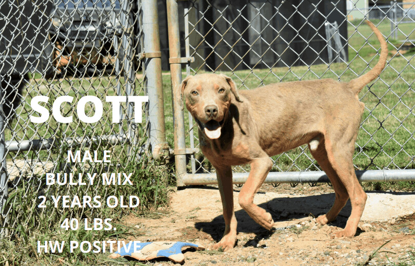 Scott is a 2 year old bully mix that is heartworm positive. If you are interested please speak to your vet about heartworm treatment before adoption, as it is owners responsibility after adoption. If there are other dogs or children in the household we recommend they meet before adoption. Scott will also be neutered and fully vaccinated before leaving BCAS.