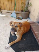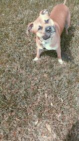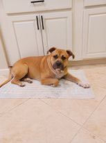 Pauley, an 18 month old 70 lb male Pitbull mix. He is cuddly and sweet and loves laps. He has had 6 hours professional Dog Training and is leash and crate trained and has good house manners. He is also trained to stay in the gate until we invited to go out. He hangs out in his crate without being prompted to go in. He is very curious and intelligent – investigates how things work and what is making the sounds. We have fostered Pauley for 3 months for a homeless couple who could no longer keep him. They found him in a wooded area in a plastic bag with 2 other puppies. He is the only one who survived and thus wants to be close to his human family. He actually watches tv with us and plays with his toys by himself in the house and yard. Because he didn’t have the litter mate socialization, we are still working on that. He reacts to new people, dogs, and noises and needs more practice in socialization. For that reason, he should not be with little children or elderly in case he get a little too happy and rambunctious. Things he needs: · A new owner with experience in training this breed – due to his high energy and inquisitive personality. · Lots of love and praise but with a firm hand · A big back yard to run and explore · No little children or elderly until he is settled in with further training · A good owner who is experienced in managing this breed This handsome boy is located in Texas but can be adopted out of state or Canada. If interested in helping this handsome boy please visit our website www.bravebullyrescue.org and fill out our adoption application.