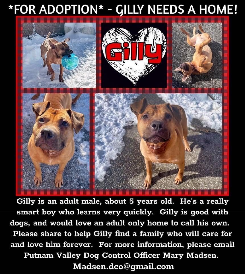 COURTESY POSTING: Handsome GILLY is one of the smartest boys in foster. Good with people he loves affection, quiet time and enjoys his daily walks. Found wondering in town with his daughter, GILLY is about 5years old and craves attention. He just wants to be loved and is looking for his new forever home. GILLY is currently being cared for by Mary, please contact Mary of Putnam Dog Control directly for more info. madsen.dco@gmail.com Putnam, Westchester, Dutchess areas only please apply. We require you to come and meet GILLY in person for any applicant to be considered. Thank you.