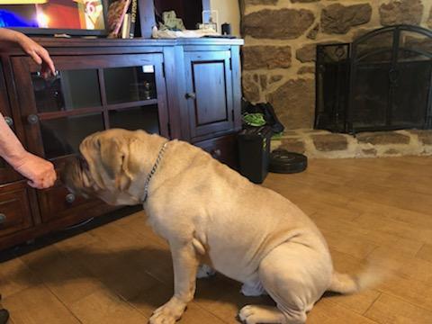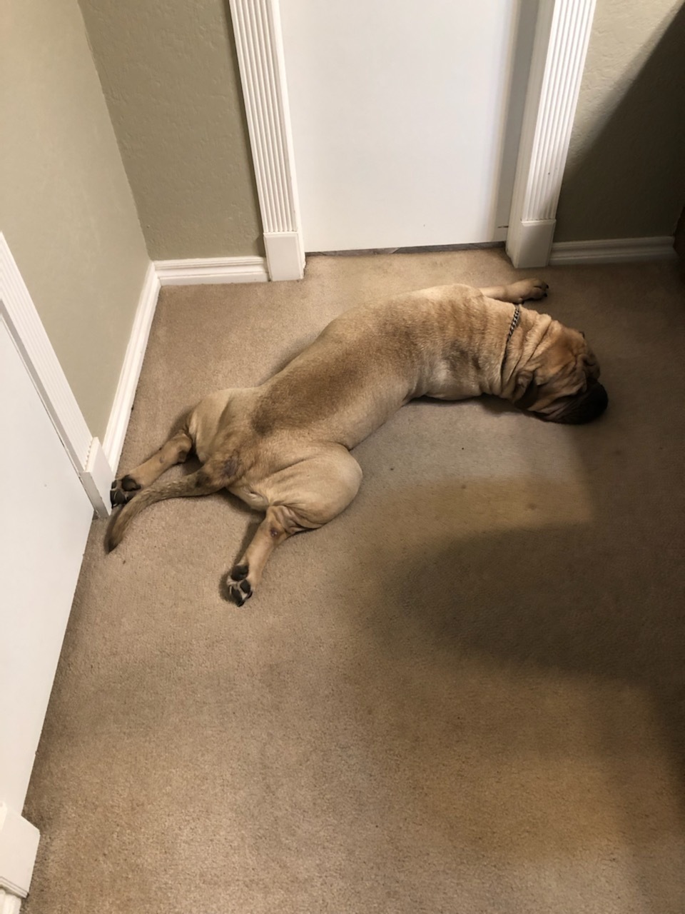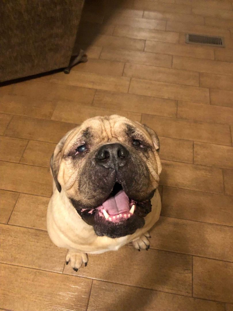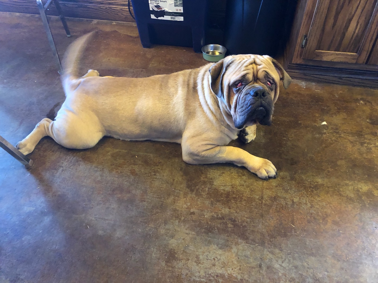 Hank is a 3 years old, neutered male. Hes had a long start with ABARS, having several eye surgeries to correct various issues with his eyes. His recovery is going great! He loves people he is introduced to, is very affectionate, follows his foster parents everywhere, and puts his head on their knees or laps for petting. We dont have any history with him with small children or cats so we dont recommend those for Hank. At his last home, he was with another intact male dog for his first 3 years and they fought a lot, he had fresh scars & bites when we picked him up, so he should probably be an only dog with experienced Bullmastiff owners. He is short & stocky. He was 85 pounds when we got him, 92 pounds now. When he feels good he gets frisky, runs & chases balls, loves chew toys like Nylabones & Benebones. He gets in the car willingly, has been very good with eye doctor visits, wags his tail through the long exams. He knows his routine of eye drops & ointments, takes his pills with cream cheese on them. Hank is located in Tulsa Oklahoma. For more information contact debbutkus@hotmail.com