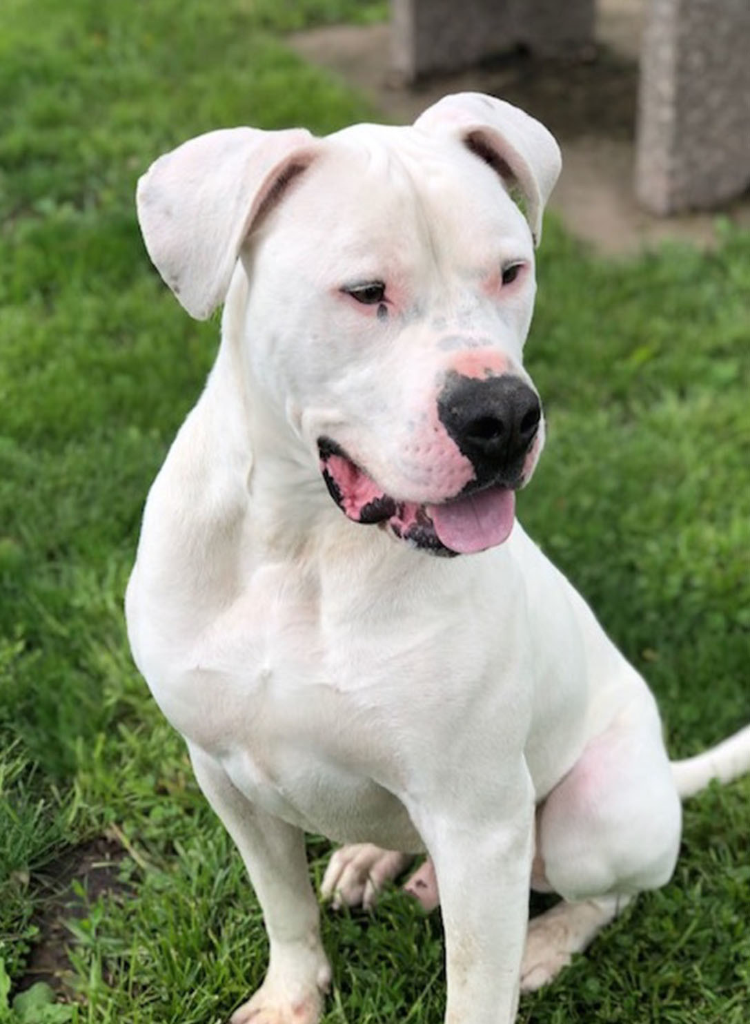 Prince was found out in the country in rising flood waters. We were very relieved to have found him before he could come to any harm. As a Dogo Argentino, he is a lovable gentle giant. He loves to play, cherishes his treats and going for long walks. Prince is DEAF. He has been working on his hand signals.He is leash trained and is grasping the hand signals with enthusiasm. Prince needs a strong caregiver that is not intimidated by his size but can give gentle direction and further work with him on his hand signals. He is currently working on making eye contact with his caregiver for instructions. He knows “Sit”, “No bark” and “No” with hand signals currently. Prince needs a person who has experience training larger dogs, and can train in a firm, confident, consistent and loving manner. He cannot go to a home with another dog as Prince can be reactive in stressful situations. We very much would love to find our big boy a dedicated family, as he is a wonderful, fascinating, loyal, affectionate boy. Visit Prince at www.hua.org!
