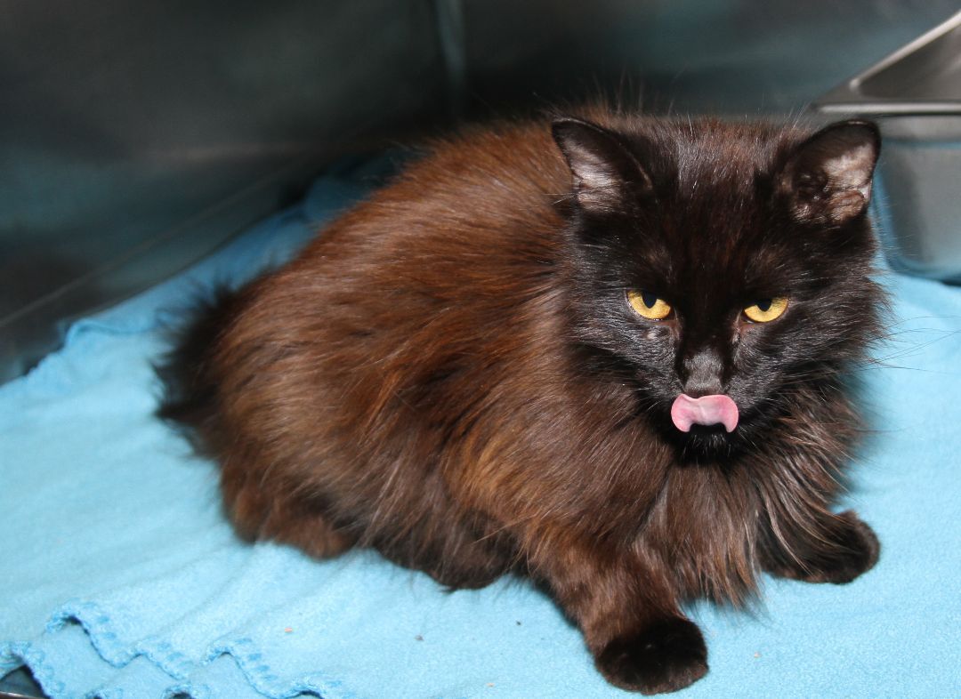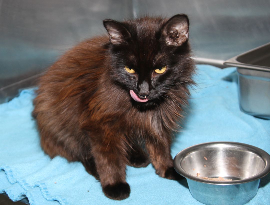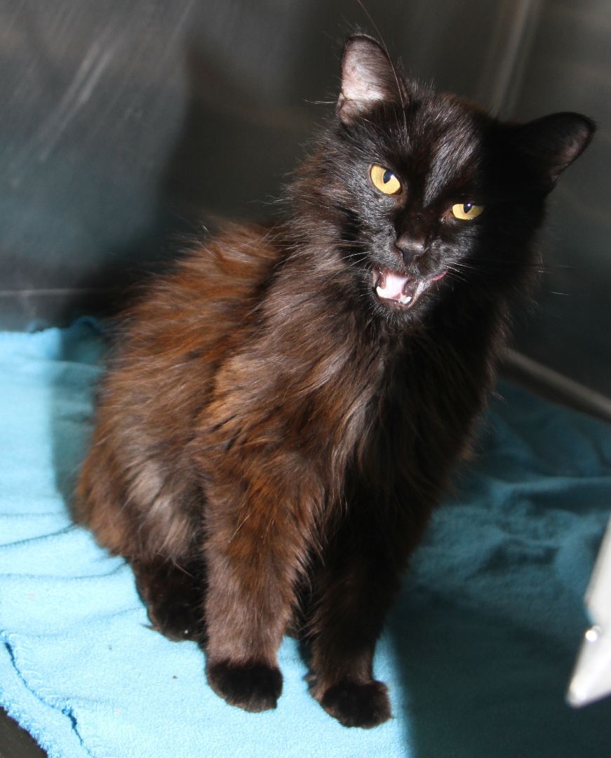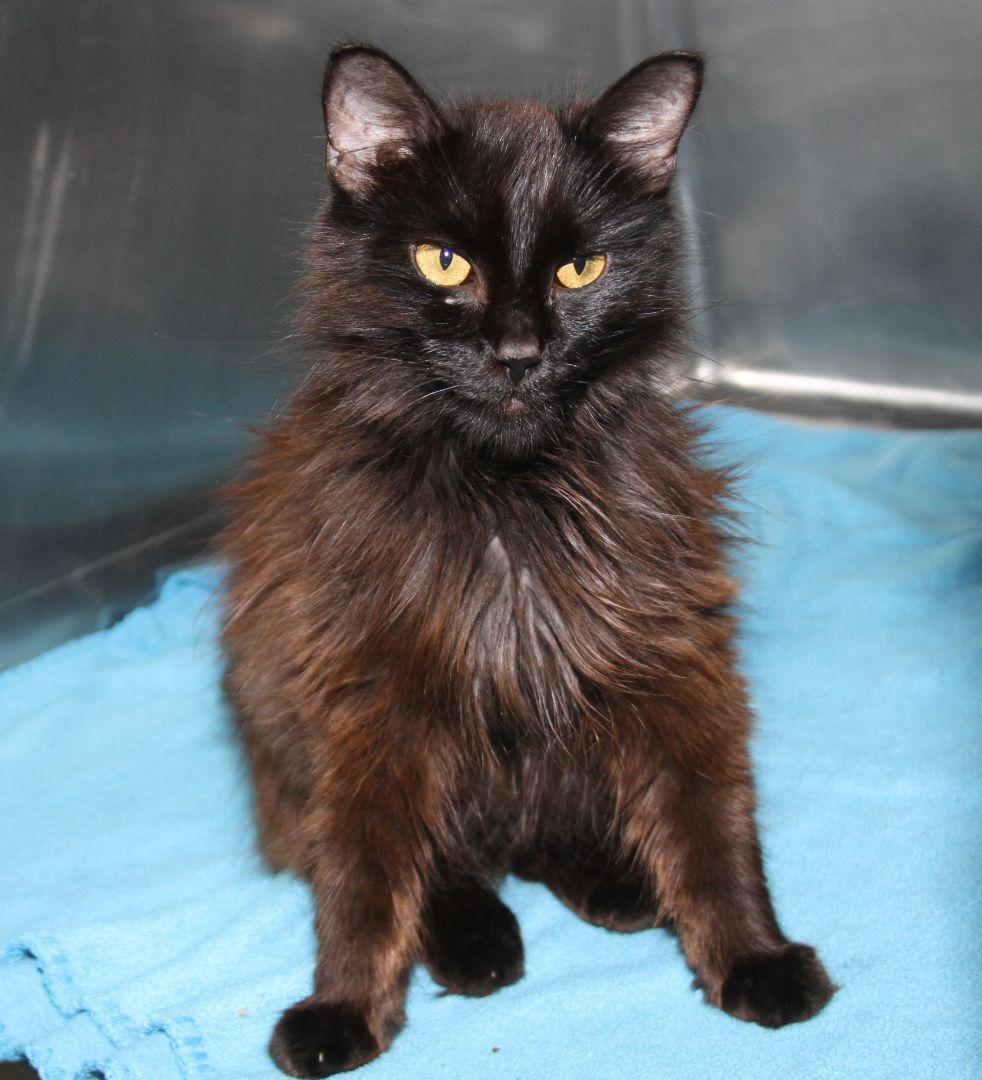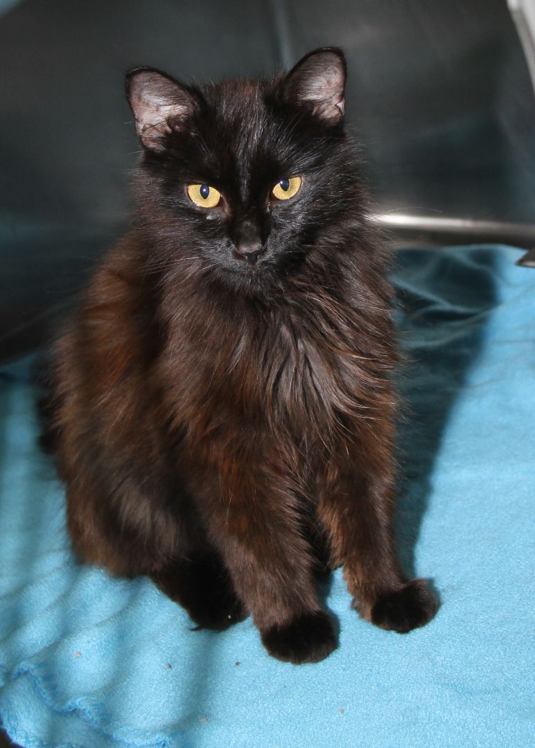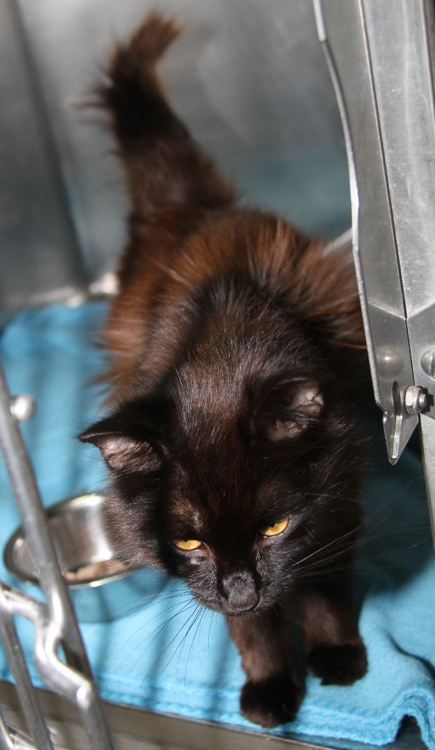 David Bowie is a petite 5-year old male kitty who arrived at the HSOV on August 4, 2022 after a Good Samaritan found him on Sandhill Road in the Marietta Ohio area and brought him to the safety of our shelter. This good-looking guy has a black long-haired coat with auburn highlights, a long fluffy tail, and a handsome face with copper-colored eyes, a black velvet nose, and long black whiskers. David Bowie has a friendly, outgoing personality and would love to find a special someone to share his life with. He yearns to have the freedom of his very own home where he could pussyfoot around to his hearts content instead of spending time in his small shelter cage. David Bowie is a pushover for his daily wet food which seems to be the highlight of his day (only second to the attention which he enjoys from our HSOV kennel techs). David Bowie was given vaccinations, wormer, and flea treatment on August 4, 2022. He was also combo tested and is negative for feline leukemia, FIV, and heartworm. David weighed just 4.2 lbs the day he arrived. David Bowie was neutered on August 22, 2022 and was also given rabies vaccine. We were happy to see that he weighed 5.8 lbs that day (thanks to the great care and plenty of good food he had received in the few weeks that he has been with us). David Bowie is ready to begin reviewing resumes of potential candidates who will have the honor of becoming his new family. Rescue groups may contact our HSOV Feline Rescue Coordinator via email (sharonpaul2@suddenlink.net). We can usually help with transportation.