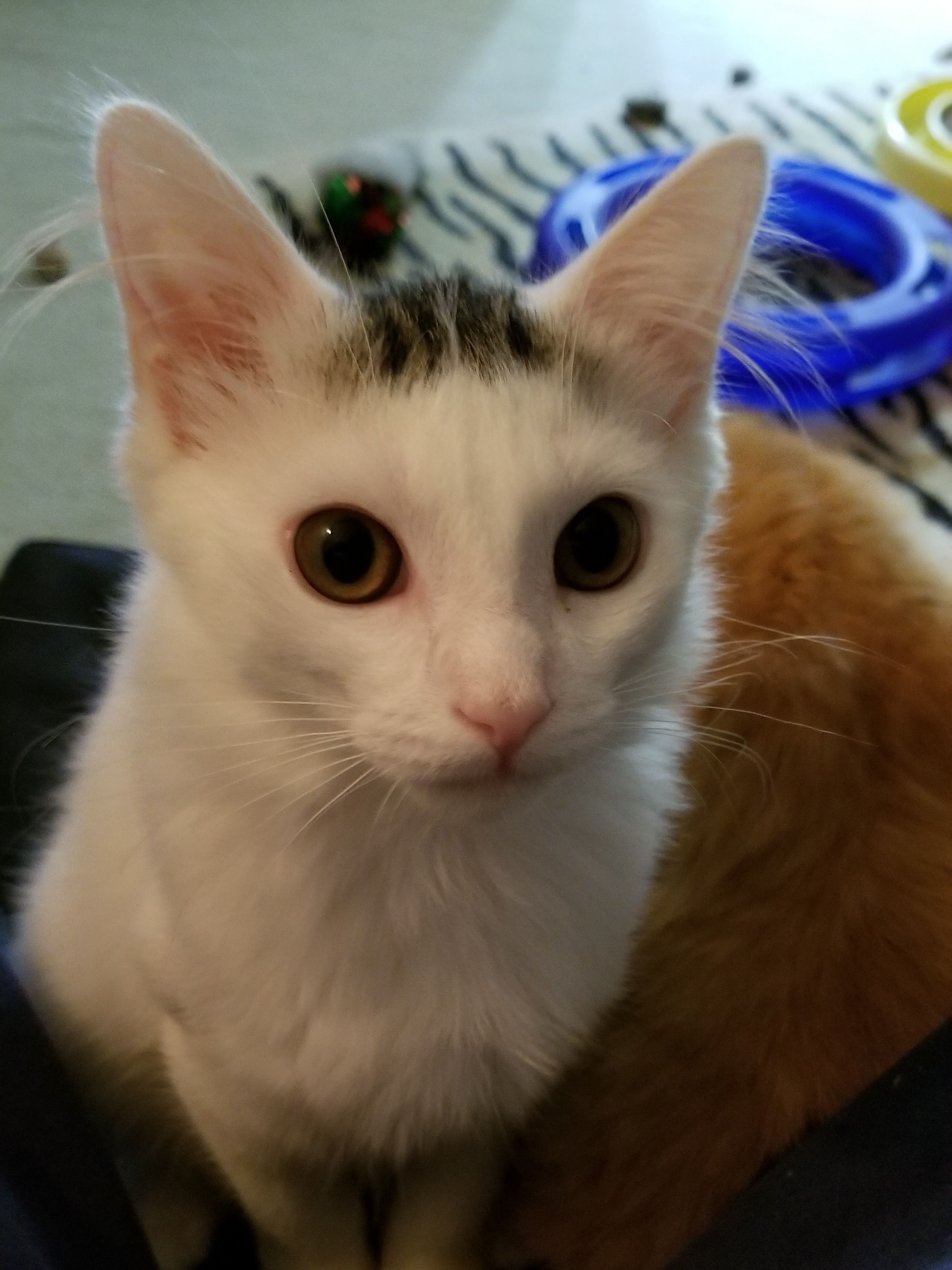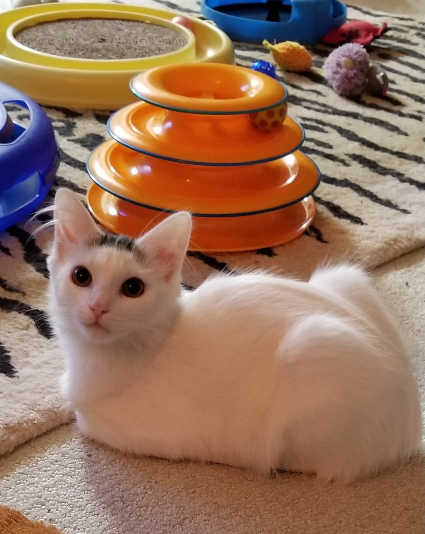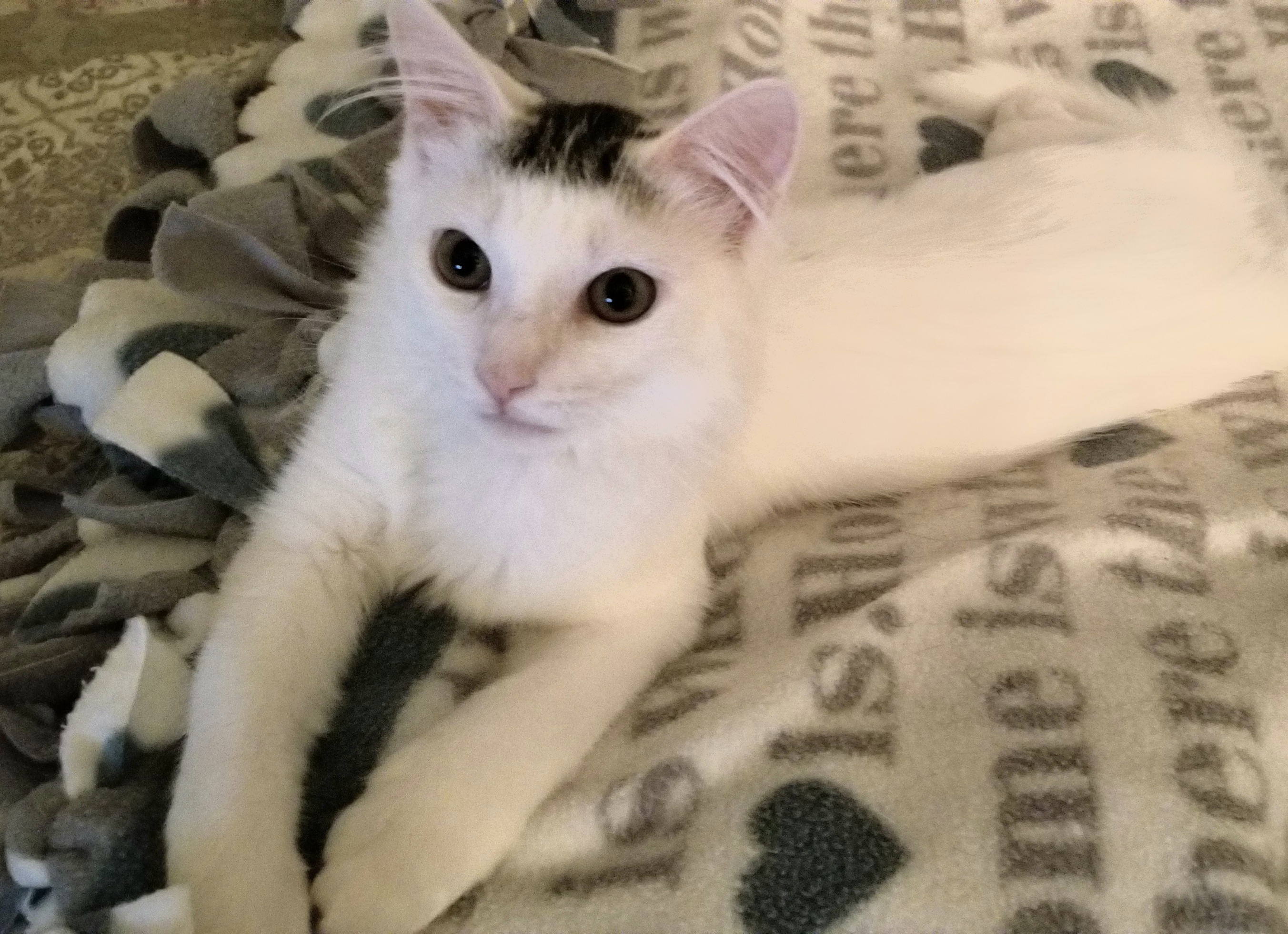 Kenny can be cautious at first introductions but once he is comfortable he is very affectionate. It will take an experienced cat owner to have patience with him.He gets along with the other foster kittens and adult resident cats so he needs another cat to boost his confidence. Loves to play with lots of toys and loving pets. His approximate DOB is in May of 2021. He is all white with a smear of black tabby just on the top of his head. He is neutered, vaccinated, chipped, dewormed, negative for FIV/FeLV. A questionnaire needs to be filled out on our website: www.homeatlastpetrescue.org in order to meet with him. We can also be called at 847-508-3232 if you have additional questions.