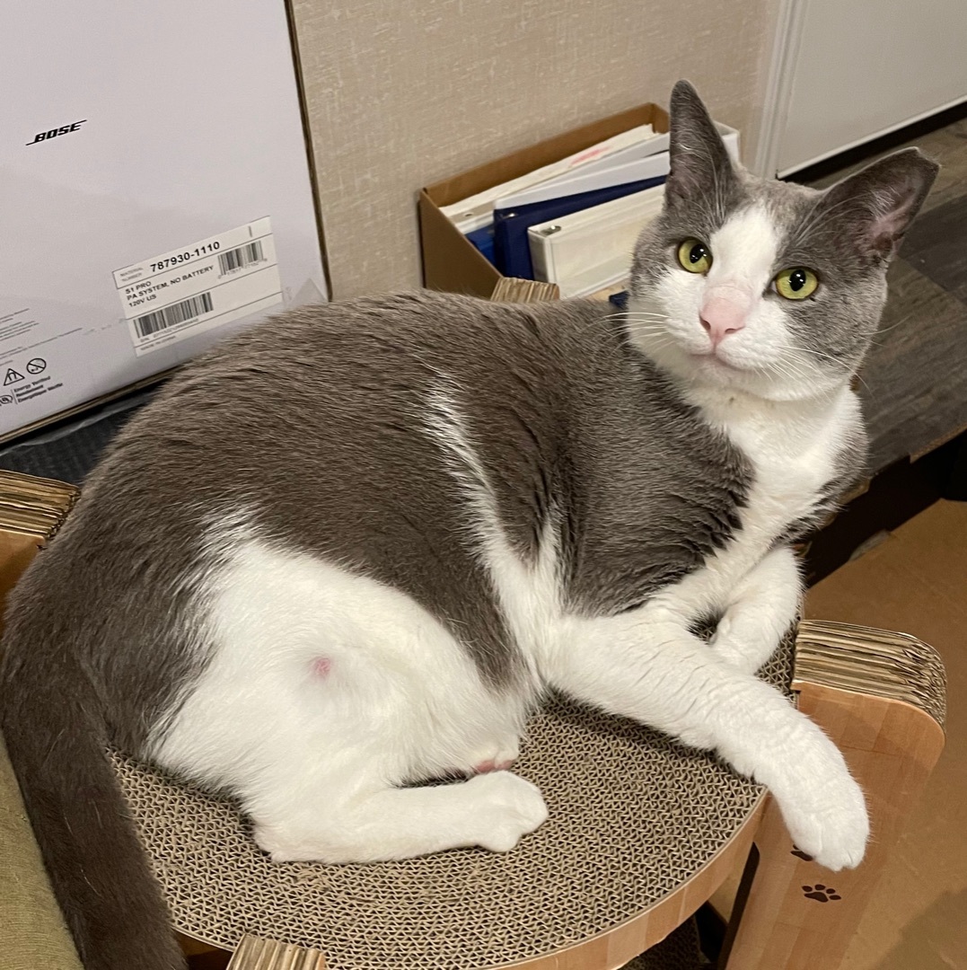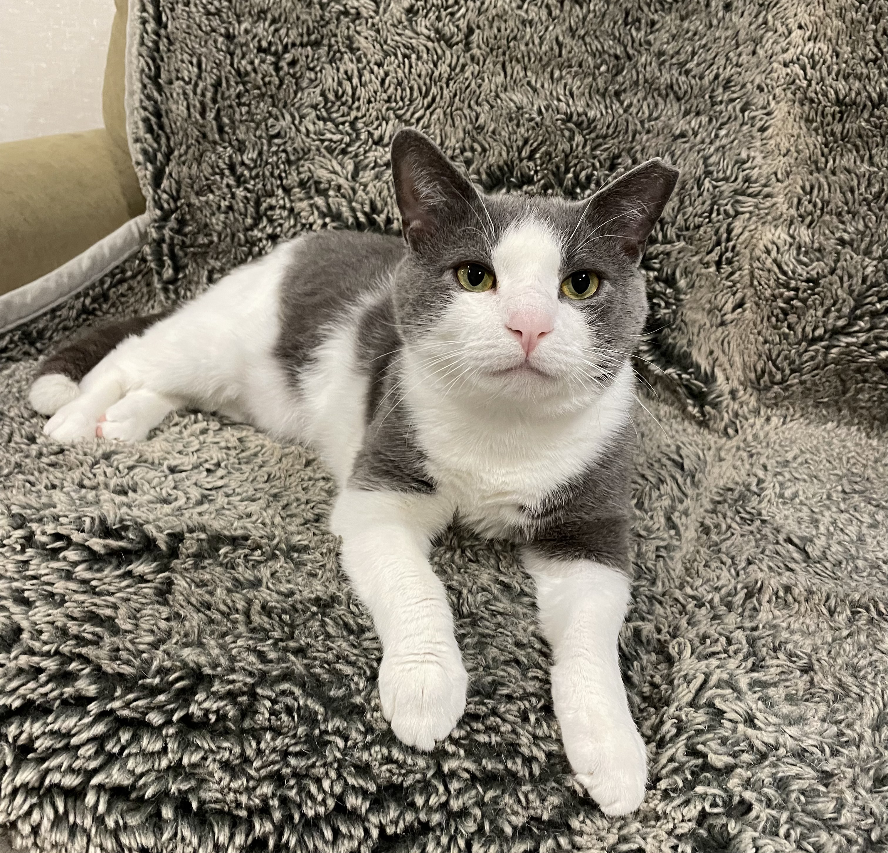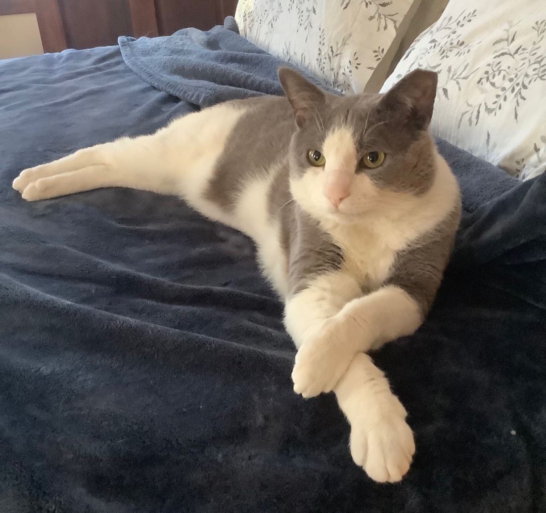 It’s adorable Simon! Simon is a friendly 3 year old cat that was rescued by OSC and is now ready for his forever home! He looks like a big snuggly teddy bear, with a handsome grey and white coat. Simon was a little shy his first few days in his foster home. Once he got accustomed to his new environment, his loving, energetic, and playful personality emerged! Simon loves his people, and will reward getting special attention with lots and lots of purrs! Simon is a silly kitty with a playful personality. He enjoys games chasing fishing pole toys as well as quiet time sitting on his humans’ laps. This big guy, with a big personality, is a joy to have around the house! Simon will do best in a home where he gets lots of attention, both for play time and for snuggles. Although he is a social butterfly, he would do better with as the only cat in the home, provided he has lots of playtime and attention from his new family. Simon isn’t fond of dogs so a canine free home is best for him. He would be fine with older children who understand quirky cat behaviors, plus petting and brushing to create a special bond! Simon needs a special diet to address his sensitive stomach and IBD. In a multiple cat home, Simon and the other cat may need to be fed separately. His foster family reports that he has been happy and healthy in their care when eating his special food! If you are looking for a new best friend to make you laugh and bring the fun, Simon may be the right guy for you! If you are interested in adopting Simon, please submit an adoption application from our website. https://orangestreetcats.org/all-pets/ or email us at: osc@orangestreetcats.org Note: Orange Street Cats is currently following a foster-to-adopt model in place of an in-person meeting prior to adoption. You will provide a foster home to the cat you are interested in adopting for a trial period. This gives you and your family an opportunity to be sure this is a good fit before you make the commitment to adopt. Our adoption team is available during and after the transition period to make sure our adopters and our cats are happy together!