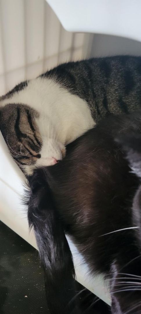 Meet Prince (brown and white male 10 years old) and Belle (black female 6 years old)! They are a package deal. You must keep them together! These two are beautiful babies, they came to us as an owner surrender and are bonded. Prince has got to be one of the sweetest big boys weve ever met. I picture him laying on top of your legs in the winter keeping you warm. And Bella is the female and of course a little more reserved. But a very sweet cat and comes right out. But you can see that shes making sure youre okay before she comes out. Shes not as happy at the shelter as prince.