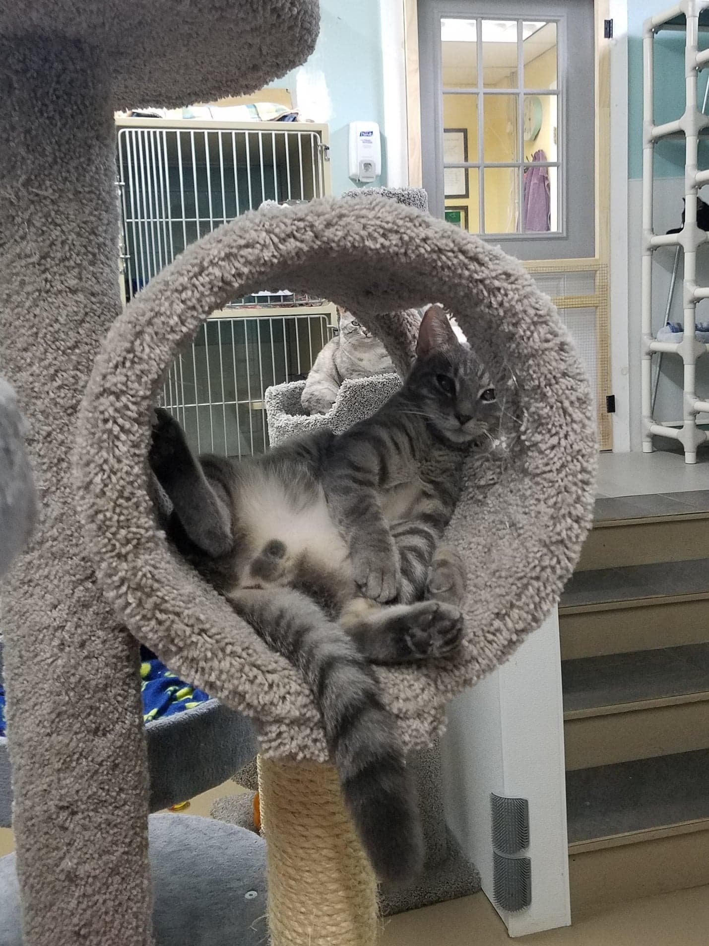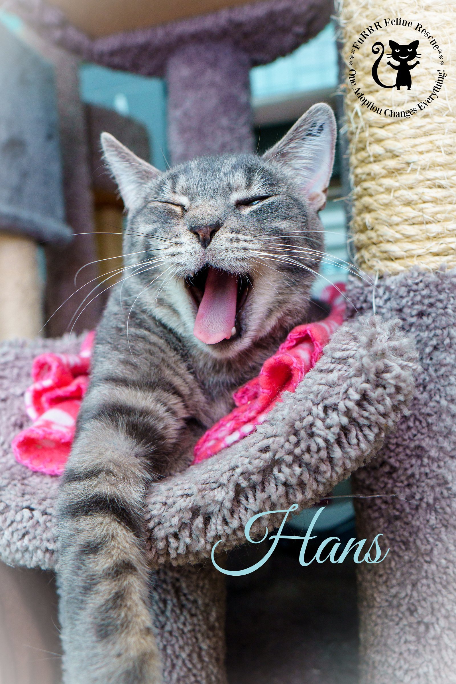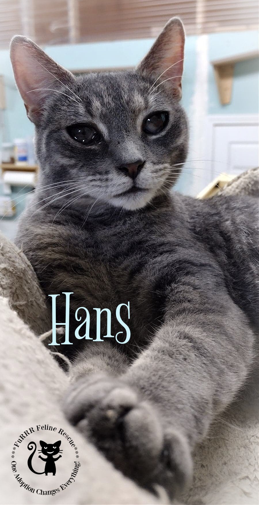 Hans - Male Neutered DOB 7/15/2021 Domestic Short Hair Gray Tabby - Hans is a super sweet, loving, friendly guy that found his way to us from North Carolina via a rescue partner. He was found as a kitten, and had been sick which caused his eyes to look dark, but let us tell you that it doesnt slow him down in the slightest! He is able to see fine and likes to wrestle with other playful kittens and cats. He will leap from the floor to the towers, up on counters, and pretty much anywhere with no issue at all. Hans is a very inquisitive boy who likes to know where you are and what you are doing at all times. If you are in another room with a door closed, he will paw at it until you let him in or you come back out lol. He loves playing with wand toys and the laser light, but is respectful when other kitties are playing too. Hans is a people cat and will need someone home most days but also will need to go home to a young playful kitty or maybe pick a playmate from other kitties at the rescue such as Hopps who he plays with at times. Hans would be fine with kids 12+ and well mannered dog. Apply at www.furrr.org to meet Hans!All kitten(s) and cat(s) at FuRRR Feline Rescue are spayed/neutered, up to date on vaccinations for their age, combo tested for FIV/FeLV, microchipped and have a Health Certificate from a licensed NH veterinarian. Our application is available to be completed online at https://furrr.org/cat-adoption-process/ Applying DOES NOT guarantee approval. We hold meet and greets with approved applications only. (Kittens are available for adoption in pairs only unless they are going home to another kitten or young cat under 3) Our policy is strictly NO DECLAWING and INDOOR ONLY. Adoption fees: Kitten to 1 yr - $275 Kitten pairs $500 Adult cat 1+ yr to 8 yr - $155 Cat 8+ - $50