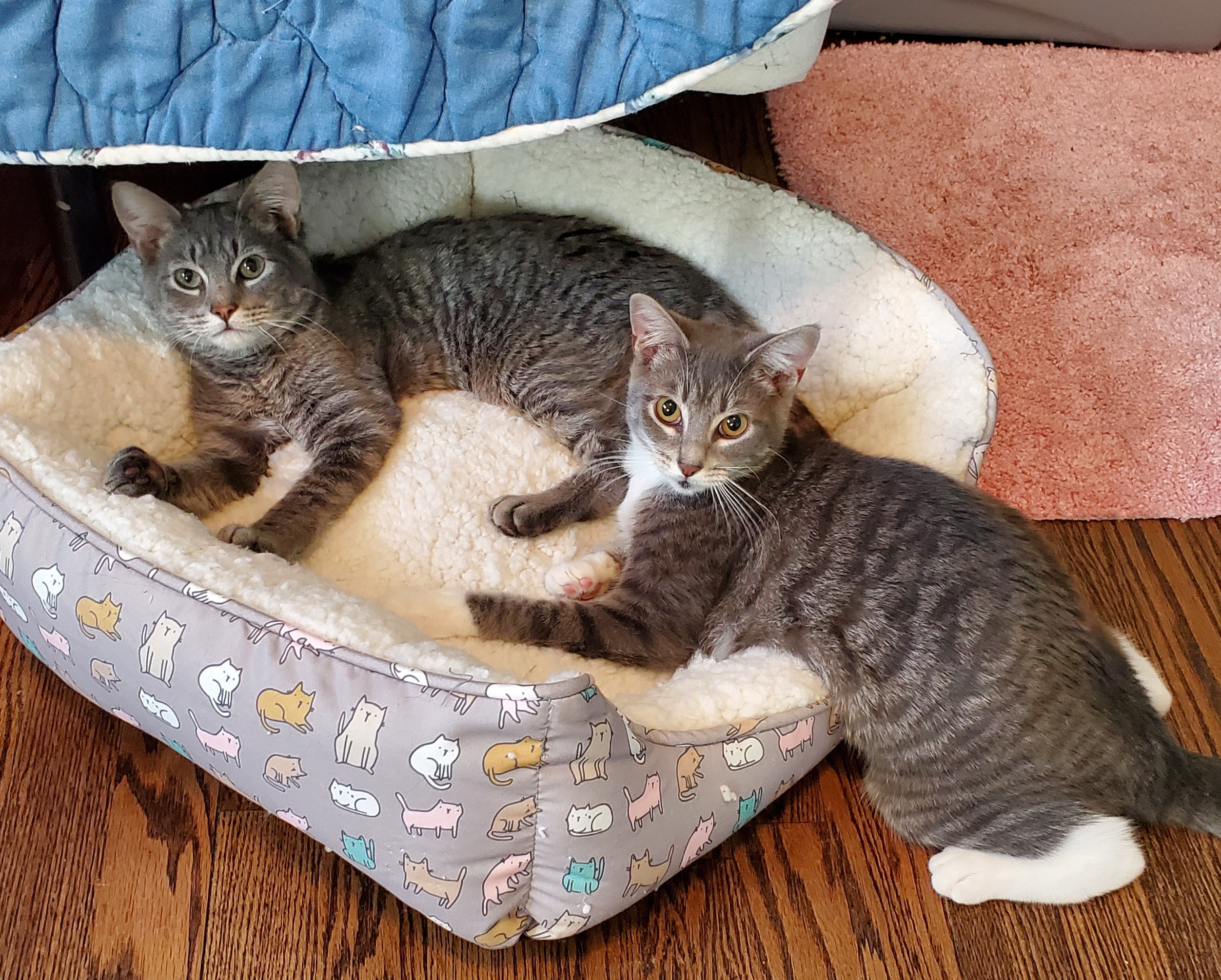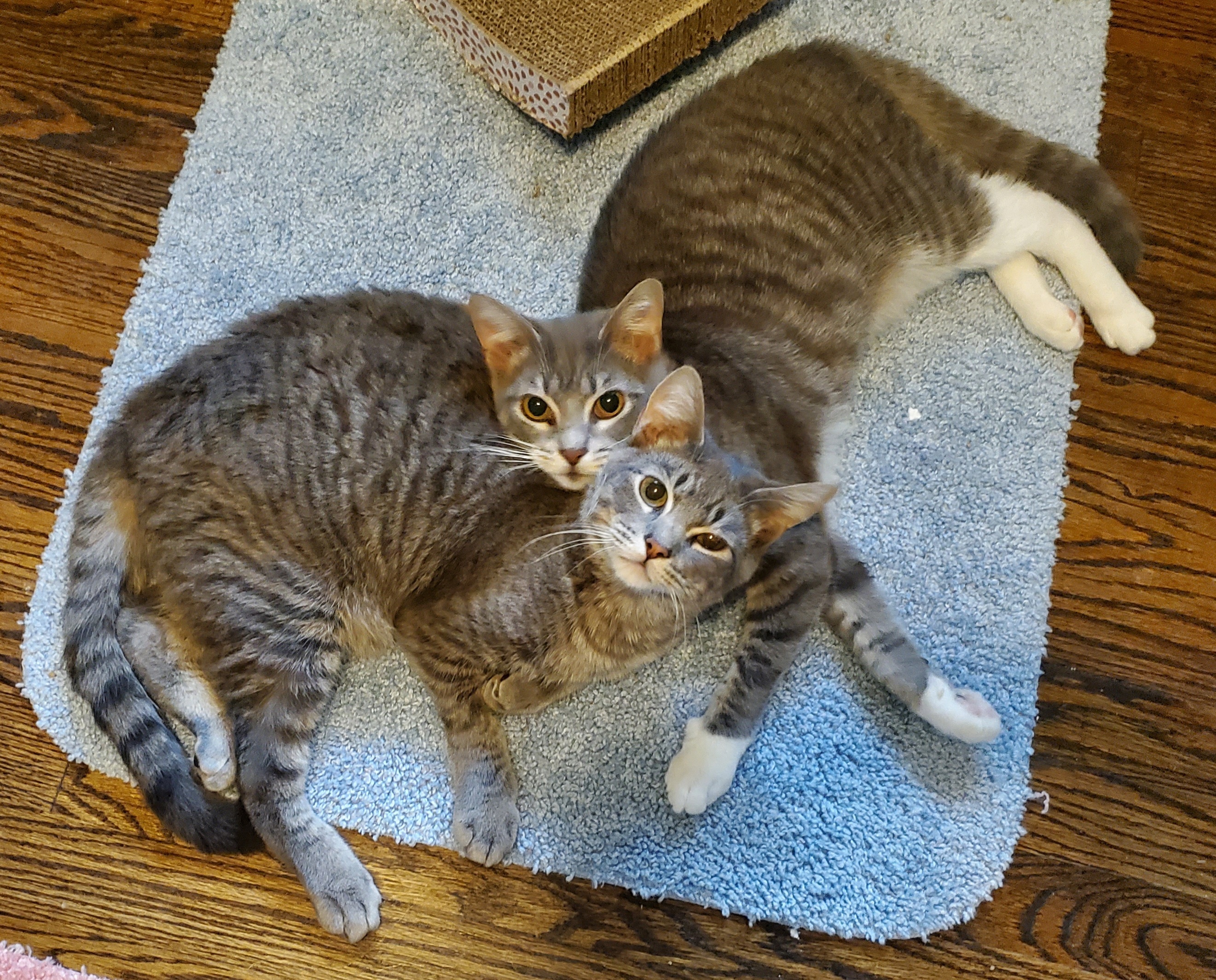 Alfie and his sister, Siri, both have cerebellar hypoplasia. The part of their brain responsible for coordination and many other things, did not form properly before they were born. The vet considers them in the mild to moderate category. They can both walk, eat, and use the litter box, though they sometimes have an accident. They have both had at least one mild seizure and sometimes go into spasms when startled by something. Now I will tell you about the important things. These 1 year old kitties are precious. They are super sweet and purr the minute you touch them. You could hold them all day long if you wanted to because they love attention. Yes, they wobble, cant climb, and cant do stairs, but they love people and love each other and would make wonderful companions. They must be adopted together. Since they cannot get out of your way, they cannot go to home home with small children or elderly people. They are not afraid of dogs, but could easily be hurt by a dog that likes to play. Their spacial awareness is affected by the CH and they may bump into things, so their adopters must be willing to make modifications to make their new home safe for them. They are staying in my office right now and I can walk away from my computer and leave my coffee on my desk because they cannot climb or jump. They can chew on wires, though, so that is something to be aware of. If you are still reading, then maybe you would be interested in learning more about CH kitties. Please do some research online before deciding if they are right for you. Please email us at scratchcats@gmail.com for any questions you have about Alfie and Siri. You can fill out an adoption application at www.scratchinc.org/adoption. UPDATE: Alfies seizure have gotten worse and he is now on daily medication. This may be temporary.