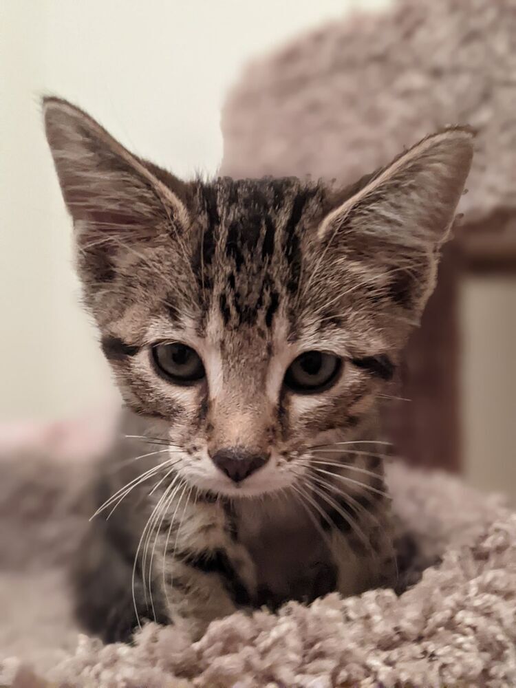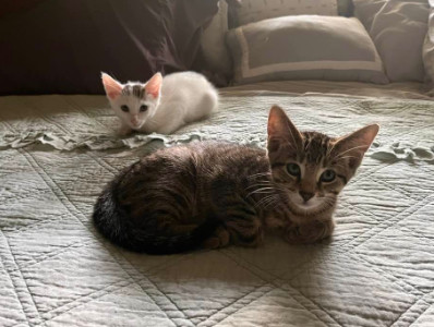 Eddie and Elmo were born on April 30. They are litter-box trained, socialized, and ready for their forever home. They are bonded and therefore should be adopted together. They love to climb and jump on their cat towers, then snuggle together, and are full of fun, high-energy, kitten mischief. Eddie loves to be held and sit on laps. Elmo is a little more independent. Elmo and Eddie will steal your heart!