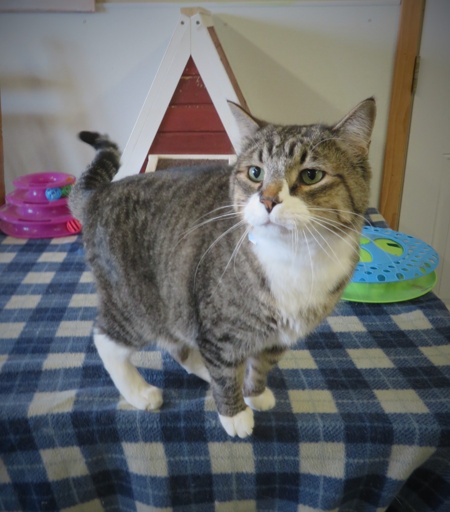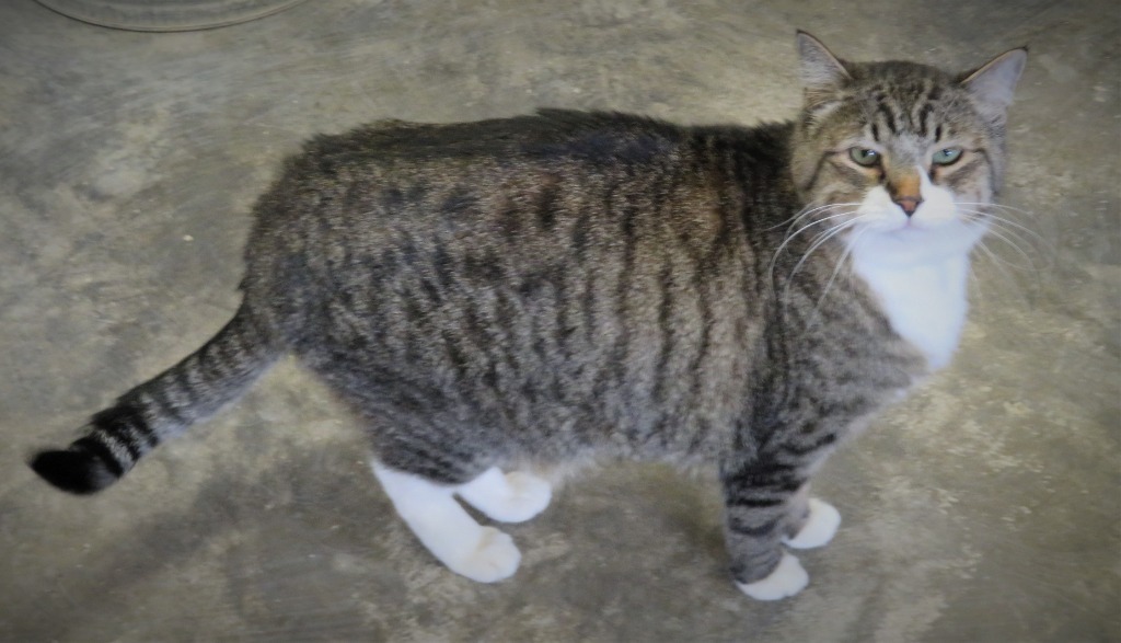 Bibs is a big round tabby that is a real sweetie. He likes to lay on his back and show you belly. He may be a bit uneasy at first but give him a treat and chin rubs then hes all in for loving. If you would like to meet him stop by any day 8-12 or call for an appointment 605-745-7283.