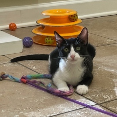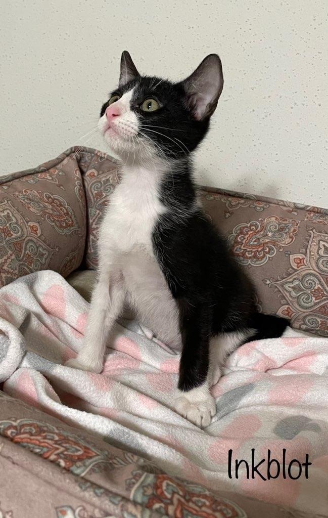 Ink Blot has on his formal attire but wants to chase after toys, wrestle, and play with his siblings. In foster care Ink Blot was not around children or dogs.