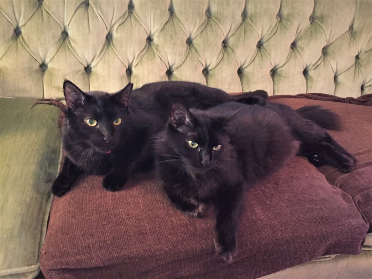 Jet showed up a couple years ago, skinny, starving, and full of fleas. He was confident and friendly from day one. We took him in right away, and he’s been super happy ever since. He’s a healthy big boy now, with a shiny black coat. He’s got an unusual narrow face and gold eyes. A people kitty, he is very inquisitive, loves attention, and loves to sleep at the foot of the bed. He would have us brush and scratch him all day if he could. Jet is one of our indoor/outdoor cats, he loves rolling in the grass and sleeping in the sun. He’s got all our neighbors charmed too. We would hate to deprive him of his outdoor experience, so we’d like to find a home with at least a screened in porch or sunroom, but ideally with a nice backyard. Willow, on the other hand is very happy living indoors. Willow is a sweet, beautiful young kitty. She has silky soft black, medium length hair. She’s about three years old, and she had a few litters of kittens before we rescued her and brought her inside. Though she was a little skittish at first, she has really warmed up, and loves to be petted and brushed. She is not a big fan of being picked up, but she will stand up like a little pony when she gets pets. She comes to us when we call her and gets very excited when she knows she’s going to get attention. A permanent homeowner as opposed to a renter would be ideal for Jet and Willow. If Jet is to be outdoors, a home safe from Coyotes and busy streets is a necessity. No dogs, preferably no other cats. Love us and we will love you back. Won’t you adopt us? My human friends will deliver us to you!