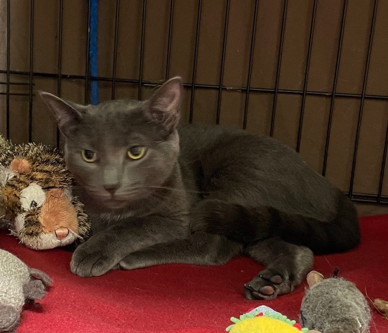 MY CONFIDENCE COMES FROM MY BROTHER! THE BASICS: • DSH, gray • YOUNG ADULT MALE; DOB: September 6, 2021 • ARRIVAL: November 23, 2021; July 26, 2022 • HISTORY: Einstein formerly known as Gravy was trapped as a stray alongside siblings Pecan, Harvest, Cranberry, and Tater. Einstein was part of a litter rescued by a local resident, he along with his siblings were brought here November 23, 2021 from a small cat colony. Although the kittens were a little nervous at arrival it didn’t take long for them to enjoy the inside pampered life. Einstein along with his brother Aristotle were adopted February 3, 2022 but sadly returned to CFC when their owner found out she was se- verely allergic to them. This was a decision that she did not want to make, but for her health it had to be done. Einstein’s best friend is his brother Aristotle, they love to play together. He loves looking out win- dows from a high perch if possible. Einstein is more social with adults, he tends to be very cautious with children. He is very curious and loves playing with toys. Einstein loves scratches and is very af- fectionate. If you are looking for a bonded pair, Einstein and Aristotle would make a great addition to your home. We would LOVE for these two to go to the same home.