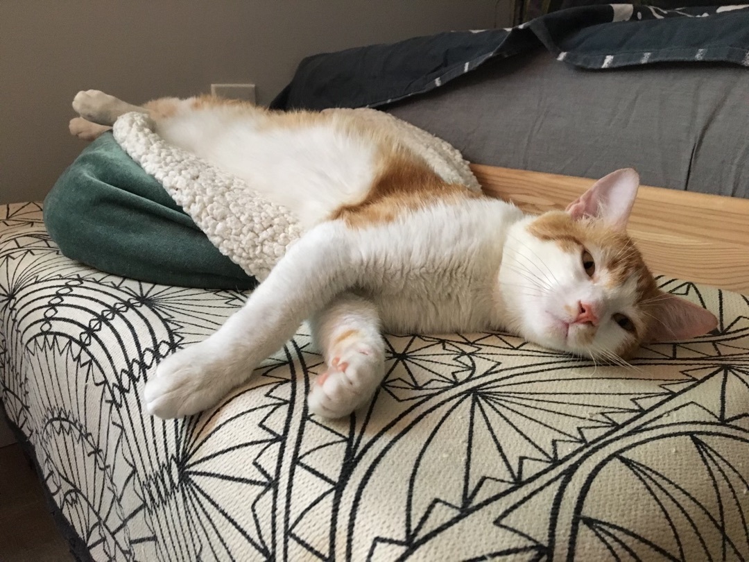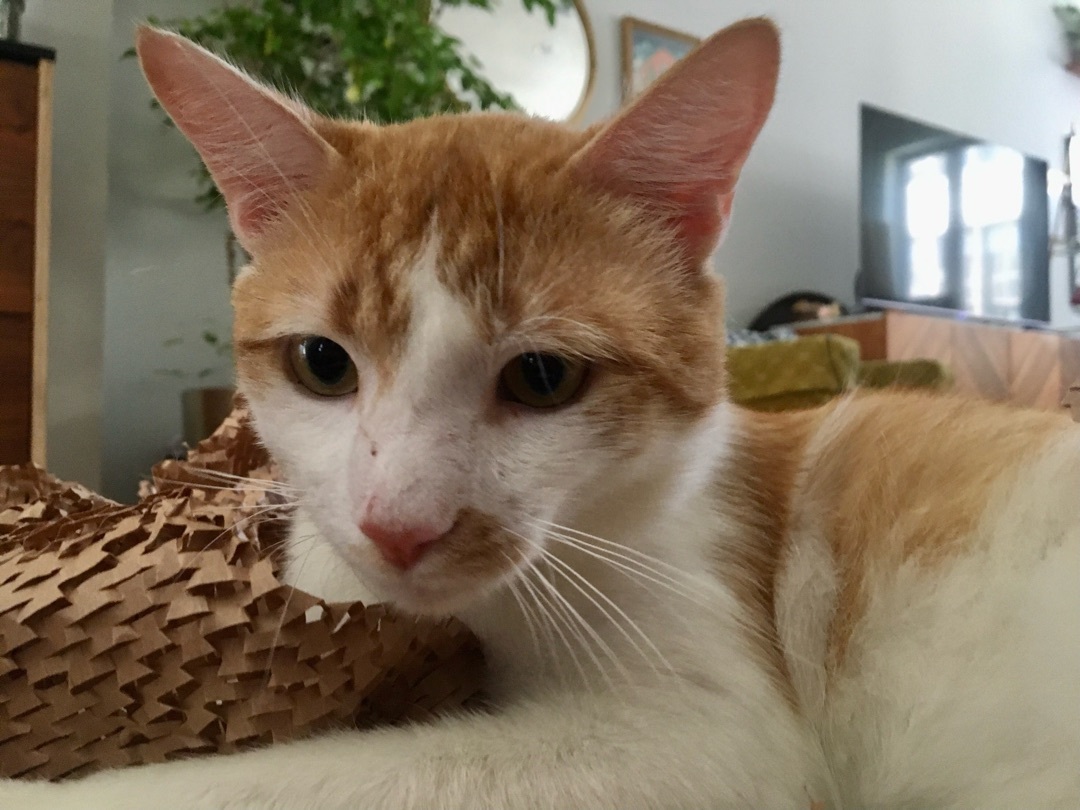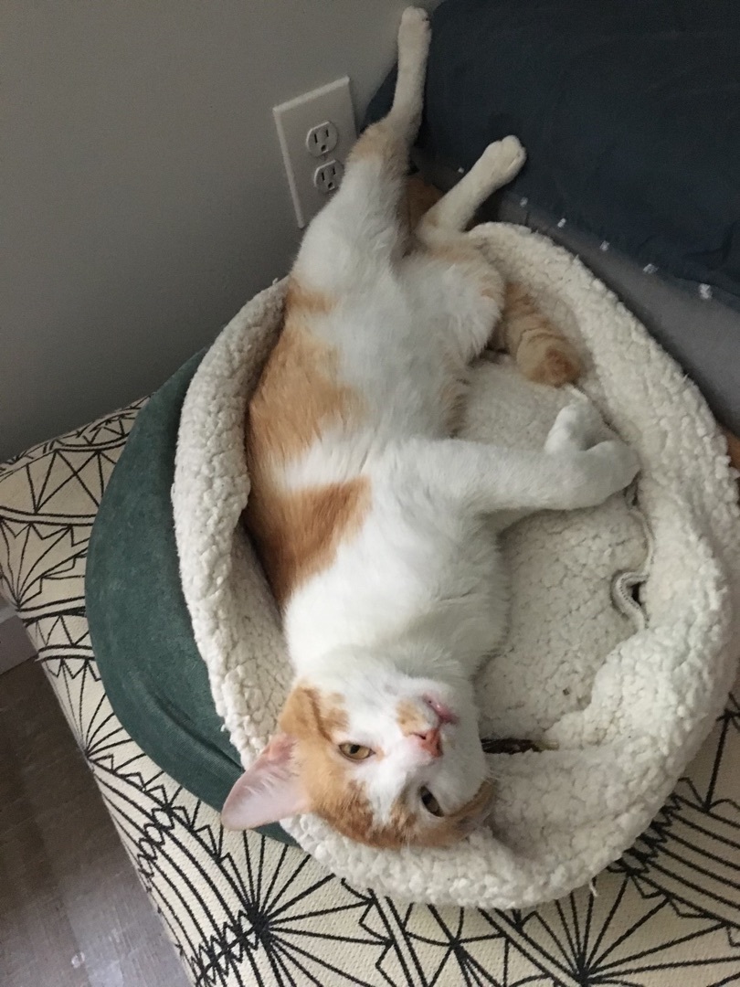 Guillermo knows a good thing when he sees it. After spending a night outside his foster family’s house peeking in the windows, he walked right in at first chance and made himself at home. He came for the other cats but stayed for the humans (and the soft beds and food!). If you’re looking for a cat who will tuck away and only come out for meals, Guillermo is not the cat for you. This little guy loves to be around people and will follow you around the house all day. When you come home, he’ll be waiting at the door to give you head butts and kisses. He loves attention, whether it’s chasing toys you throw for him or snuggling up next to you while you watch TV, which hopefully you can hear over his extremely loud purr. He likes and wants to be around other cats – sometimes a little too much – and is learning how to give them space and play gently. He might do well with a young, playful cat or dog. Guillermo would do well with older children and any adult who wants to lavish attention on him.