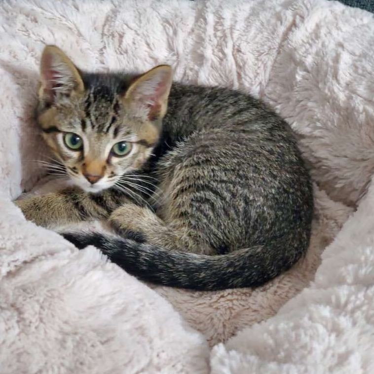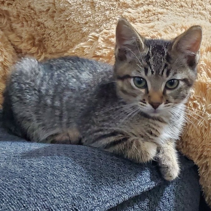 Hi, my name is TJ! I really came out of my shell within the last few weeks, but before, I was a little weary of humans and tensed up my whole body when they touched me. Im still understanding love and attention, but I will let you pet me and pick me up. My favorite thing is to be with one of the adult cats in my foster home, shes kinda taken me in as her own. When not doing that, I am cuddling with the other kittens and playing with all the toys!