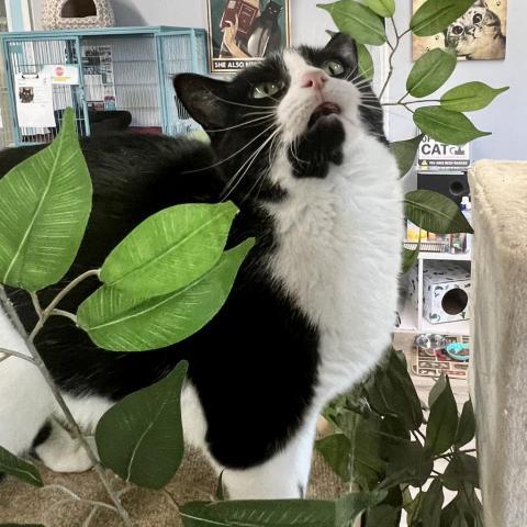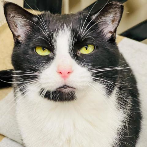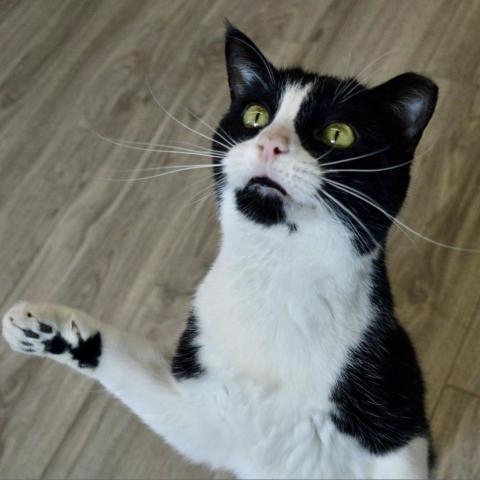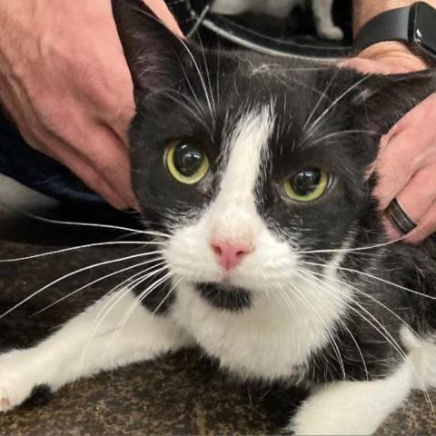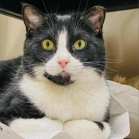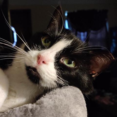 After a stint in the shelter and not really having a good time, Hereford is doing GREAT in his foster home. His foster mom Melissa says: Hereford is a wonderful kitty! He took a few days to warm up but has gotten comfortable with me at my home and loves to cuddle up on/next to me. He is treat motivated but also loves head scratches, belly pets and talks back with his teeny little mews. He will waltz back and forth purring while I pet him head to tail. He likes to play with his feather fishing pole toy but spends most of his time napping. Hes a horizontal and vertical scratcher and loves perching in his cat tree, stretching on his tall scratcher and uses his cardboard horizontal scratchers. Hereford is a very laid back kitty in a laid back atmosphere. If theres more activity going on, he can be vocal and gets a little restless. When not much is happening, Hereford is purring and getting cozy in his favorite spots. He will sleep uninterrupted for hours and has not exhibited any late night misbehaviors to wake me up and doesnt get zoomies. He sleeps in and pretty much stays silent unless he thinks youre talking to him or thinks you have food for him. He will do a lot of things in anticipation of a treat and will often come when called for. If he is in the right mood he will even tolerate light brushing and getting his claw tips clipped. He doesnt care to be held but will tolerate being picked up and placed back down respectfully. He is not too shy to approach visitors especially if they might have some food! Hereford would make a wonderful companion to anyone looking for a chill cat that loves to nap, cuddle and enjoy the single life!