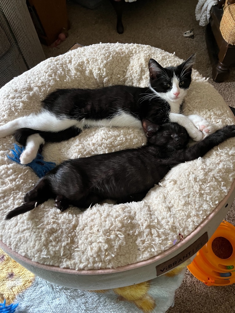 These two brothers start purring as soon as they see you! Foster home has cats, dogs and grandchildren visits so these two are comfortable with all. Very sweet and loving. No adoption fee Just want them together in loving safe home Sylvester is black and white and Benji is all black