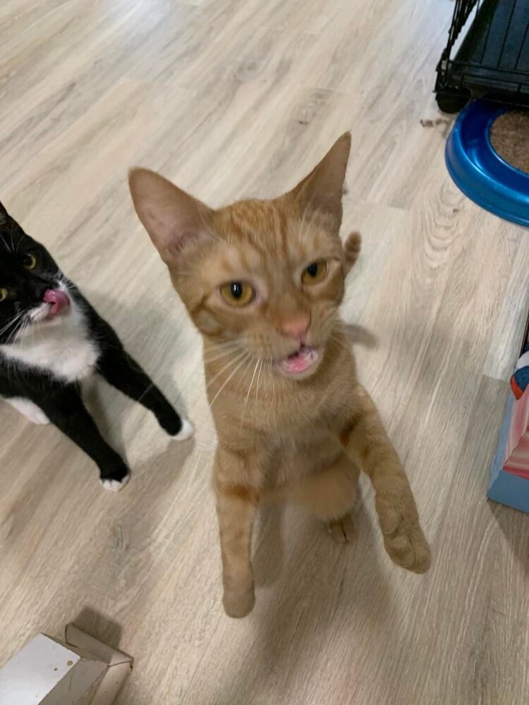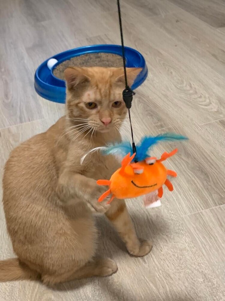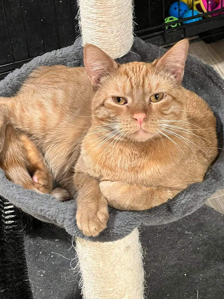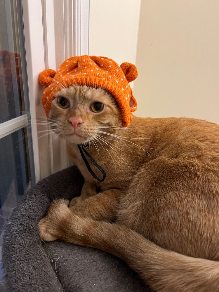 Age/DOB: 5-17-21 This is Pumpkin! He has been in foster care for just over a year and its time he found his forever home. Dont let. his "grumpy face" fool you! This boy is nothing but love and deserves to be in a forever home that is ready for a sweet, affectionate guy that loves to chase wand toys and lasers but also lounge in your lap to sleep while you give him lots of love! Hes such a sweet guy but has been passed over because he is a young adult and not a kitten. But a sweet guy like this is a gem! Unlike a kitten, youll already know his personality. Sweet, loving and kind! He welcomes any new foster cata/kittens that come to his foster moms home and is always ready to make a friend. He loves the kittens and gets the nickname of Uncle Pumpkin because he loves to watch them play through the kennel gate. If youre looking for that guy who is sweet, gentle and will be your best friend, Pumpkin is it! Given his sweet nature, he would do great in a household with children, adults, and probably dogs - although he has not been around dogs yet. His fosters imaginary family for him would be one with one or two young kids (around 6 or older) that are gentle with pets and have lots of love to give. Im sure he would love to have a kitty friend too as he is very social with any new cats or kittens that arrive in his foster home. If you are willing to give Pumpkin a chance, fill out an adoption application with Purrs & Whiskers and hopefully you can take him home with you! I need to eat a special diet so my tummy doesnt get upset, but the rescue can tell you more about it if you are interested in me. A little history about me... I was rescued from a colony that was being cared for by a widow whose husband had recently passed away. He had been the primary caretaker for our colony, but when he passed, his wife took over caring for us. However, some of the cats started having kittens (likes and my littermates) and the lady was put in contact with Purrs & Whiskers (P&W) to help. P&W Trapped, Spayed/Neutered, Vaccinated and Returned (TNVRd) all the feral adult cats and saved the sweet kittens. Now the colony is stable with the feral cats and the kittens are all finding great homes! Im hoping to find mine too! Could you possibly be my furever family? Fill out an app and lets see where this journey takes us! I am spayed/neutered, tested negative for FIV/ FeLV, microchipped, dewormed, treated with Revolution, and am up-to-date on age-appropriate vaccines. You may apply to adopt at www.purrsandwhiskers.org/adopt