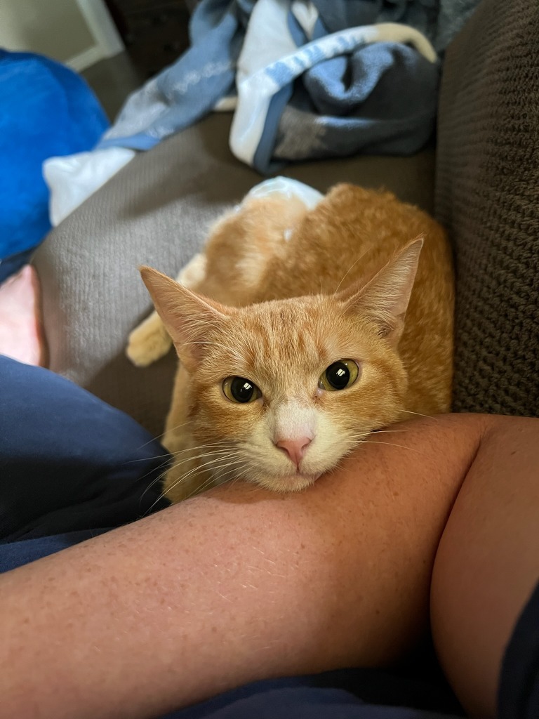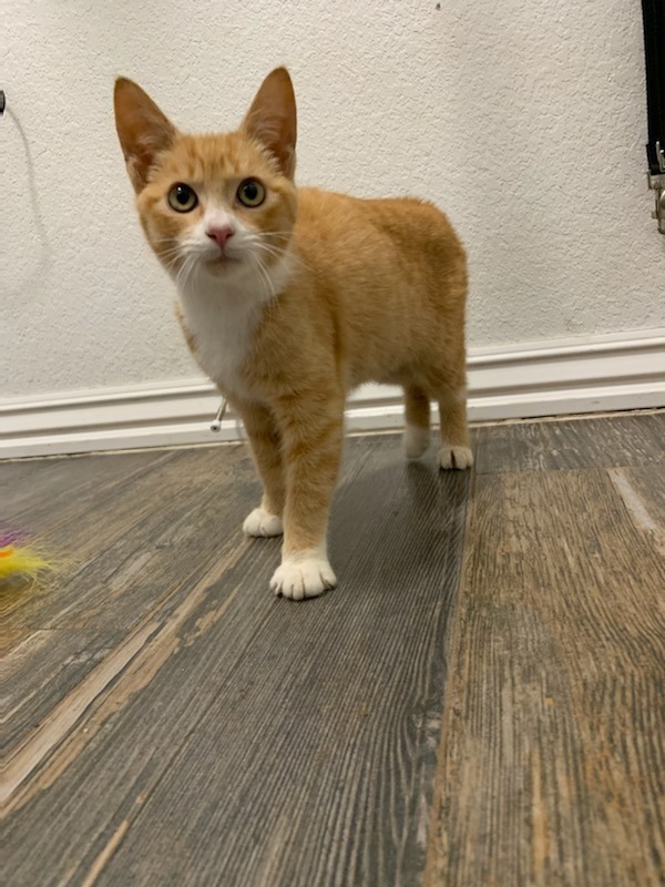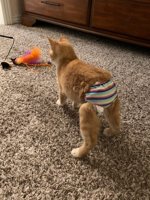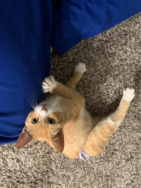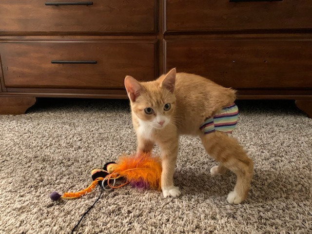 Denver loves to play, purr, and find rays of sunshine to lay in! :) Hell even let you know when he thinks he needs more attention with a cute little chirp. He was born with no tail and and it is called manx syndrome. Manx kittiesoriginate from the tiny Isle of Man in the Irish Sea. Manx cats carry a unique gene - known as the Manx gene, or just the M gene - which prevents the vertebrae in the tail (coccygeal vertebrae) forming. His form of Manx syndrome causes him to be unable to control his bowel movements. He will never be litter box trained due to his condition. He wears diapers when roaming about the house and playing! He will need to be expressed twice a day and we can show you how to do this and have a vet consultation to also help show you! We offer two months post adoption care in helping to show you how to express his bladder and colon. He has to eat a special gastrointestinal food, which he loves and eats like a champ! He is super snuggly and loves to be held. He even gives kisses, he reaches out his little paws and pull your face close to his for a little smooch! If you think this sweet little special boy would be a good addition to your family please apply at www.animalaid.org/adopt