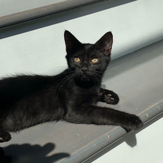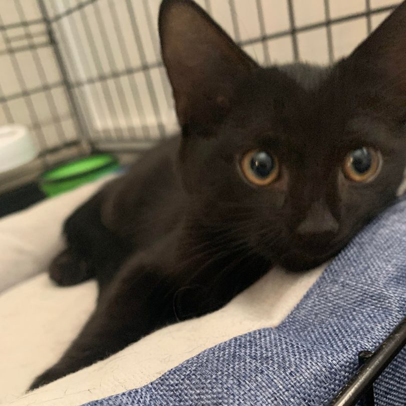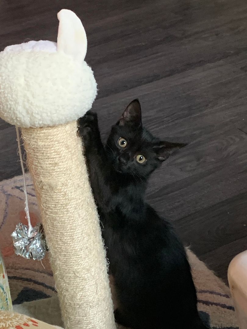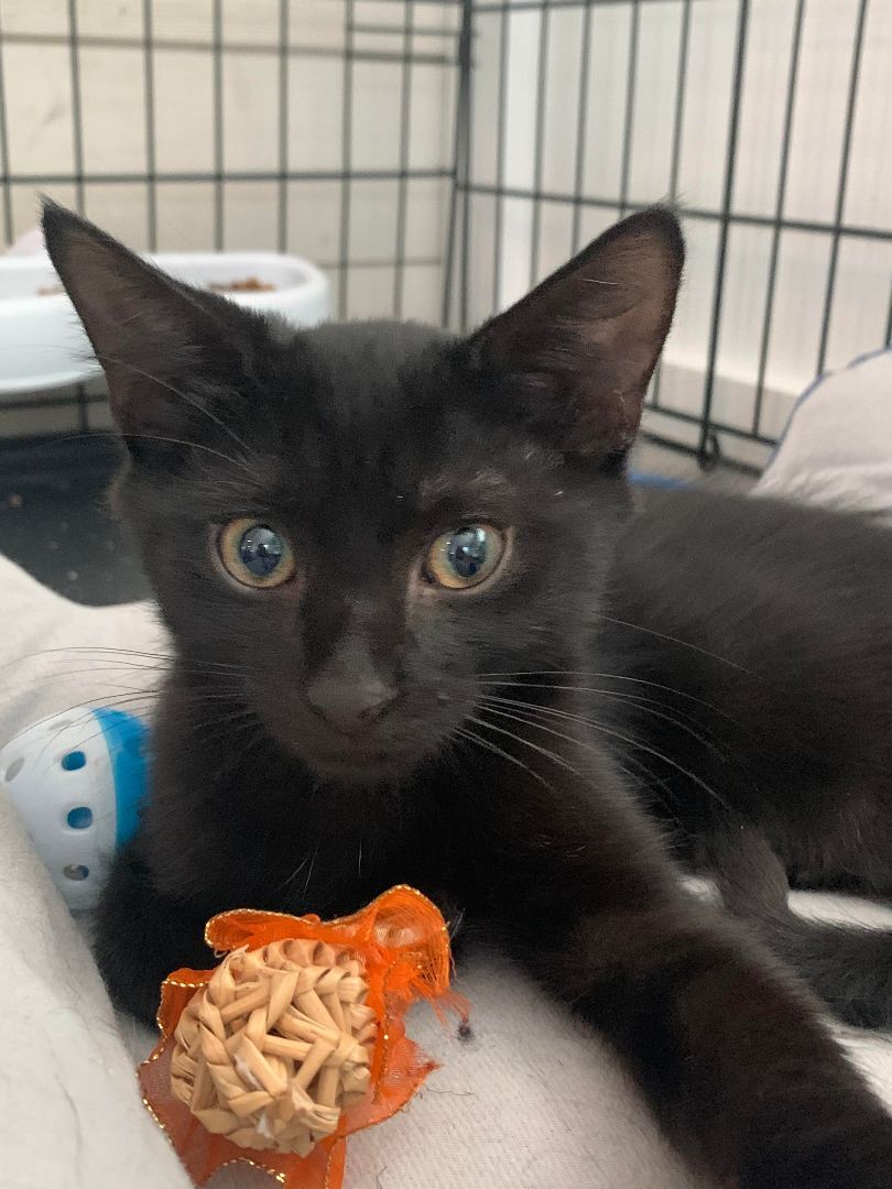 Born in early May, George came to Cat Tales though a trapping project. He was very scared at first but learned to trust very quickly. This gorgeous house panther jumps right down to greet you when you enter the room. He loves to climb and chase the small foil crinkle balls around and loves to play with the other kittens in his foster home. If you are looking for a playful house panther, George might be your guy! He would do best in a home that has plenty of play things around and safe places to climb like a cat tree or secure shelves. *****If this profile is active on Petfinder, the kitty is still available and has not already been approved for adoption. You do not need to message to ask us if the kitty is still available.***** If you are interested in adopting this kitty, please submit an application online at www.CatTalesInc.org and a Cat Tales Adoption Application Review Team member will contact you within 72 hours by email to begin processing your application and answer any questions you have. All kitties from Cat Tales will be spayed/neutered, vaccinated, dewormed, and microchipped before they go to their homes. Please note that most kittens are not big/old enough for spay/neuter until they reach approximately 12 or 13 weeks. Most kittens posted here are below that age, so please note their DOB here and understand that they will not be ready for adoption until they have been fully vetted.