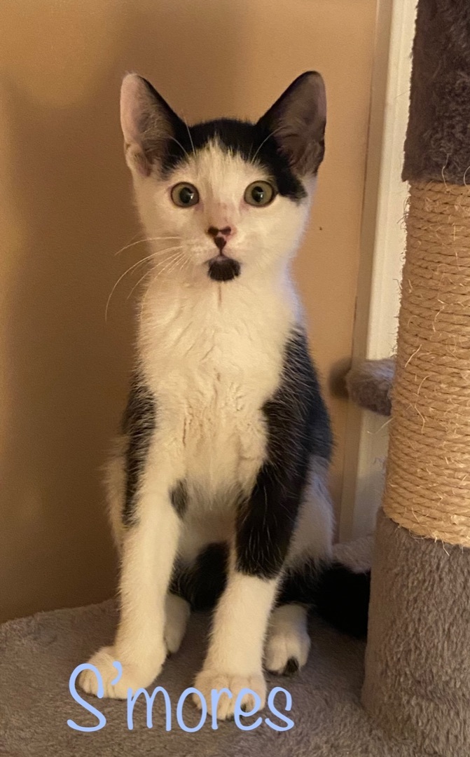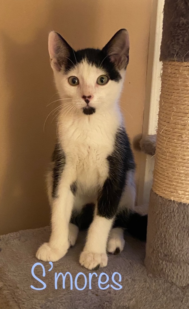 Meet the handsome boy S’mores! He is approximately 3-4 months old. S’mores is a friendly boy who is learning to be confident and comfortable around people. He has blossomed into a ‘talker’ and a boy who likes affection. S’mores loves to play, and loves to eat! He also loves catnip, as you can see in the video how he rolled around in it! JVC prefers to adopt kittens in pairs. S’mores would be best if adopted his sister Shadow. S’mores could also be adopted to a home with young cats. If you are interested in adopting S’mores, please email your contact information to joy.181831@gmail.com. Personal and vet references required.