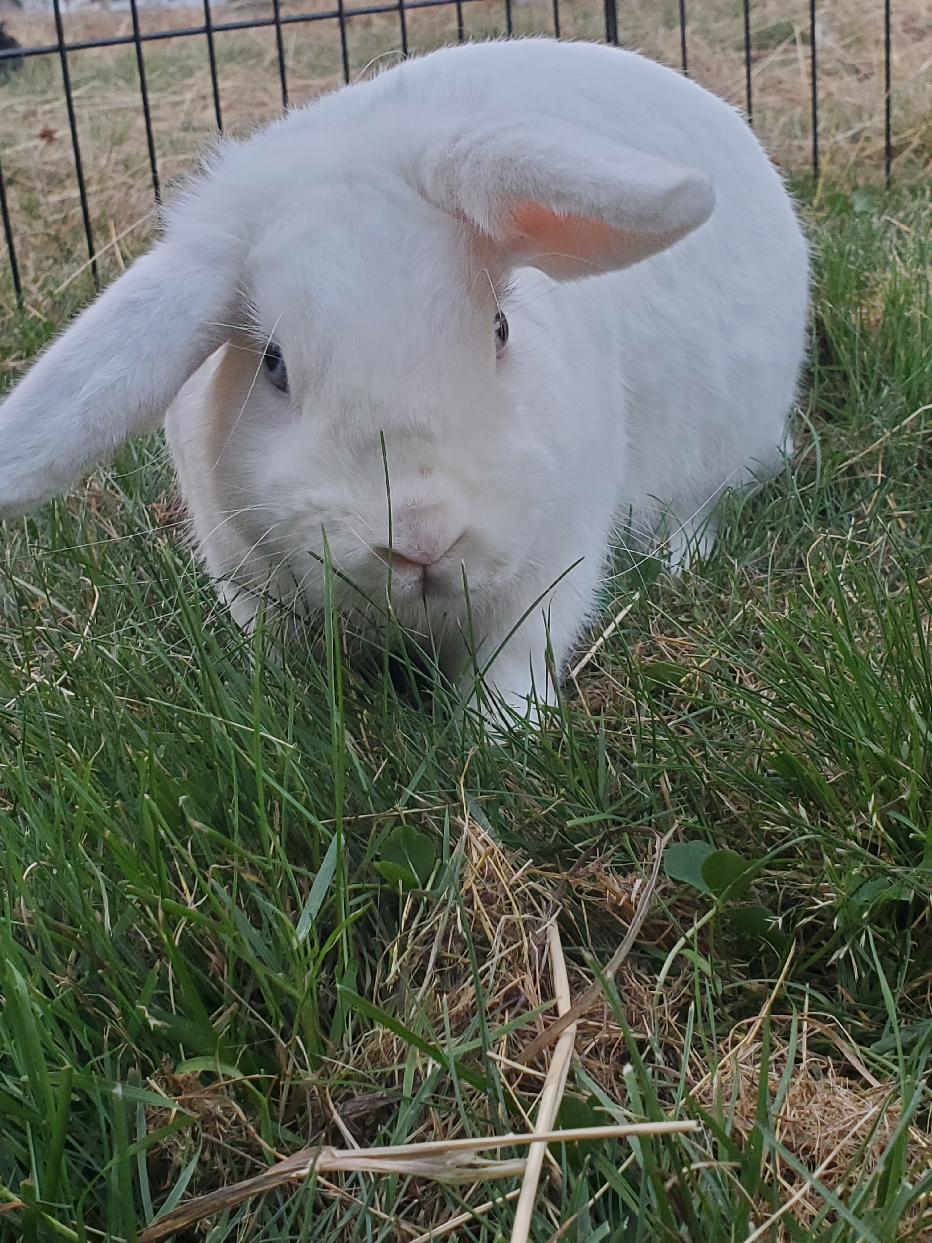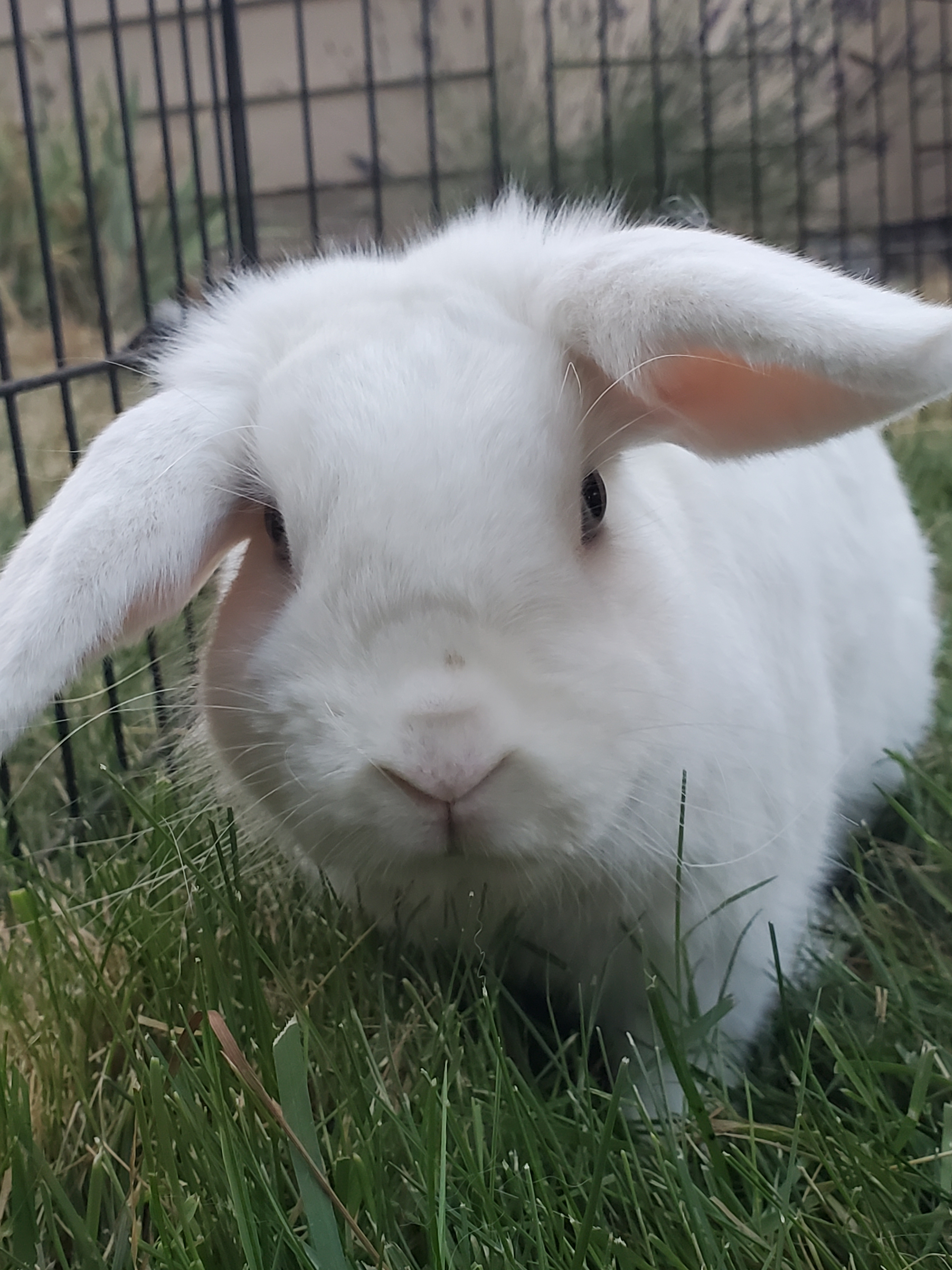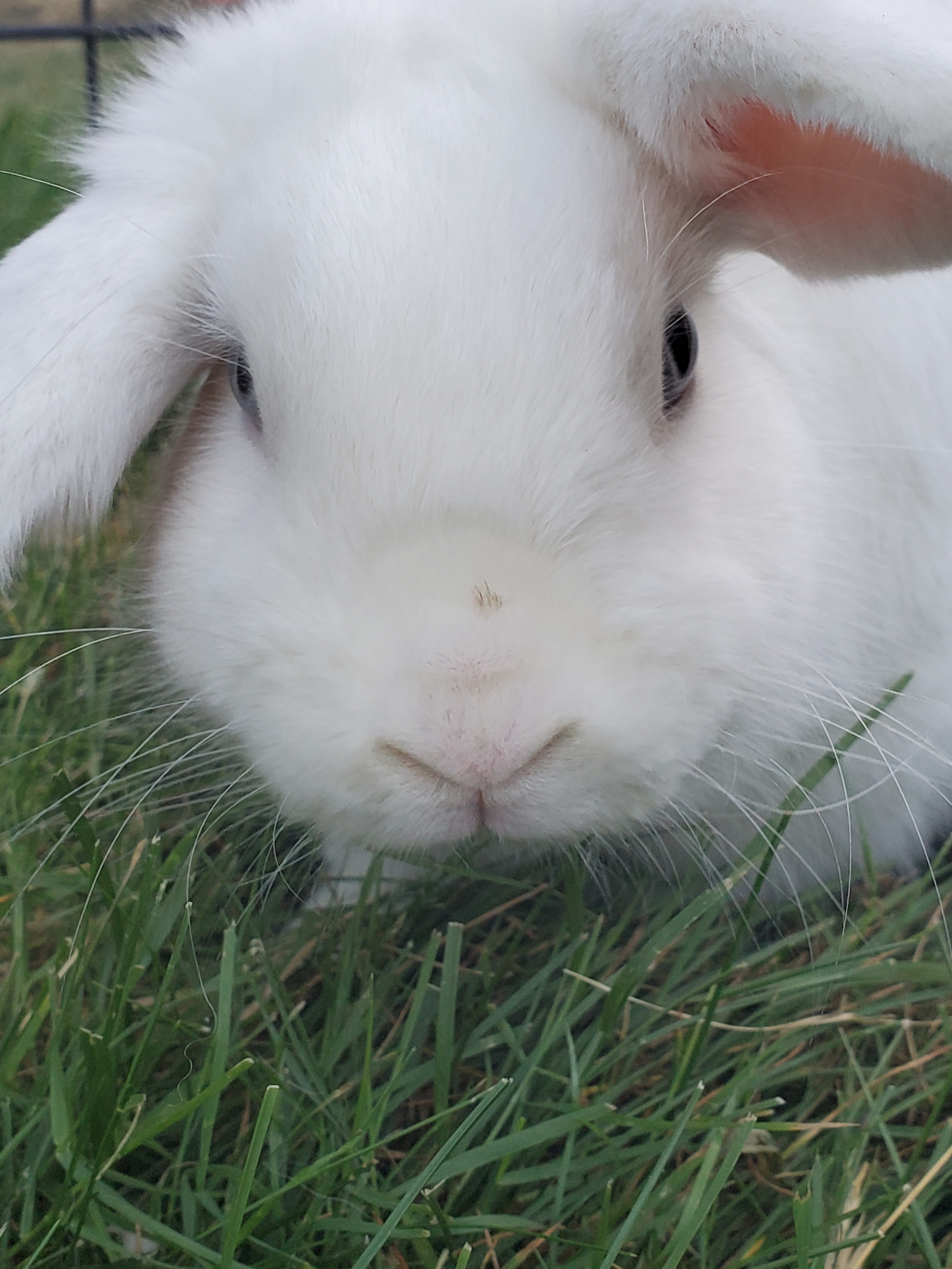 Snowball was born here at the rescue when his mama came in pregnant. Although he does not look it he is part Dutch. His mama is Dutch but dont know who daddy bunny is. He is such a goofball. He does not like to be touched but is very bouncy if you do touch him. He is definitely an alpha bunny but may do well with a calm docile female friend. If you are interested in him please fill out an application on our website at Binkybunnytalesrescue.com
