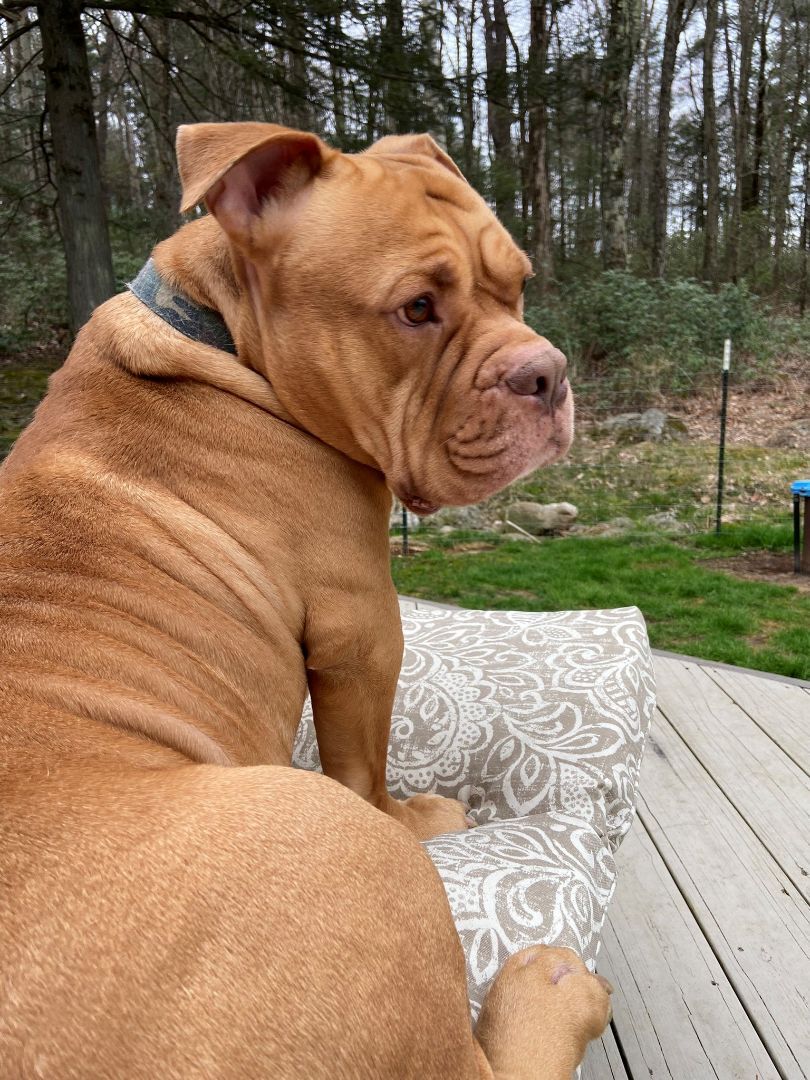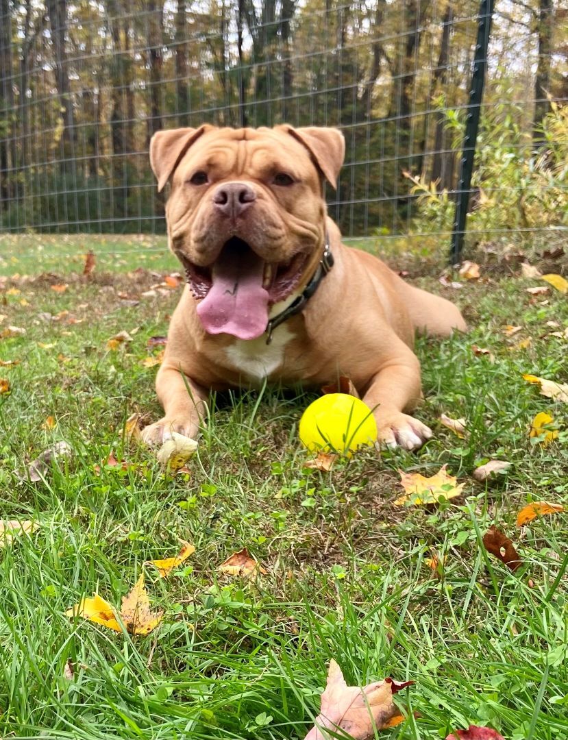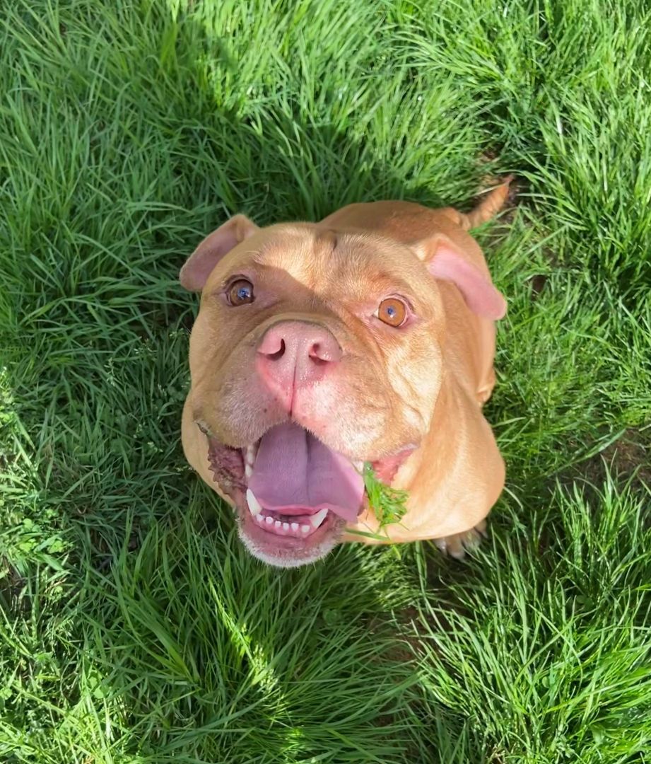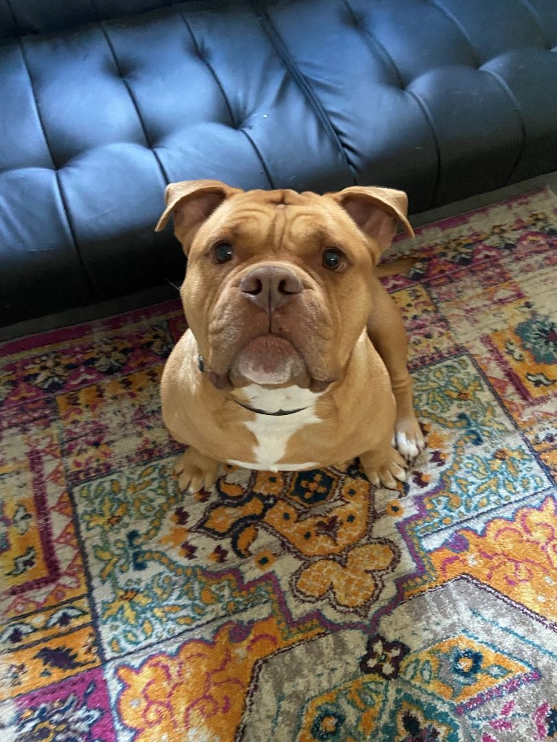 Cerus is (best guess) an English Bulldog/Bull Mastiff mix who will most likely fall into the category of "pit bull" He is approximately 3 years old and a strong, stubborn, independent bro who will also just melt your heart with his big eyes and squish face. Cerus came to our rescue with fear aggression towards men and terrified to be touched or lay on his back and had absolutely no manners at all. We have been working with him over the past year and he has made amazing strides and is ready for his forever home! He now walks respectfully on a leash- with the proper leash style, knows sit, down, wait and come, loves his crate for crate training, and will "drop it" for food. He enjoys cuddle time on his terms but its daily... :) He is still incredibly stubborn, and likes to test the boundaries of rules, and he thinks everything belongs in his mouth. We think the right adopter is out there for him though because... he really is a good boi with the right owner! Ideal placement for him would be in a home with highly saavy dog owners with dog training experience, and prior bully breed experience. They will need to be committed to continued training and establishing clear and constant boundaries with assertive yet loving energy. Cerus does not respond well to anger or aggressive energy as our best guess someone tried to "train" him this way previously and it only instilled in him fear. He seems uninterested in other dogs, but he is definitely not a sharer, so would do best as an only dog- dont worry one Cerus is enough to keep you on your toes! Sorry no children or cats as he is a very dominant dog and would most likely push them around. If you are interested in Cerus more than one meet and greet would be required to ensure a good fit between him and potential adopter. We know hes a tough placement, but earning his love and respect and being able to give him a home where he knows hes a "good boi" is an amazing feeling! We know from experience!